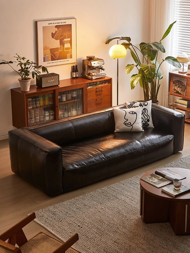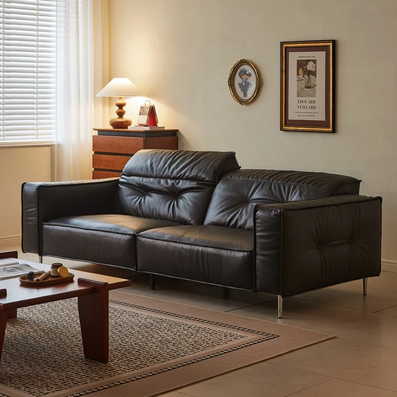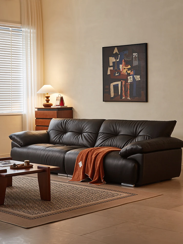 MoMo Italian Minimalist Black Genuine Leather Cotton Candy Sofa - Luxurious Top-Grain Leather Retro Modern Living Room Sofa