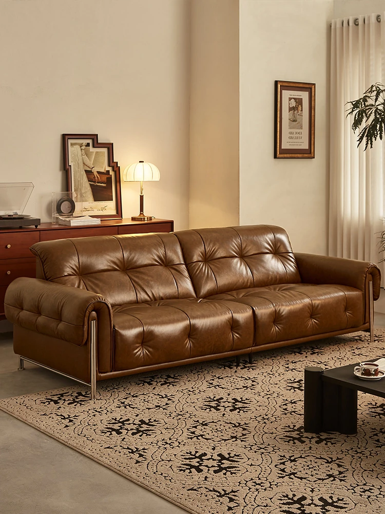 Vintage French Style Leather Sofa - Retro Oil Wax Leather in Brown Caramel Color, Perfect for Your Living Room, Luxurious Comfort and Timeless Elegance