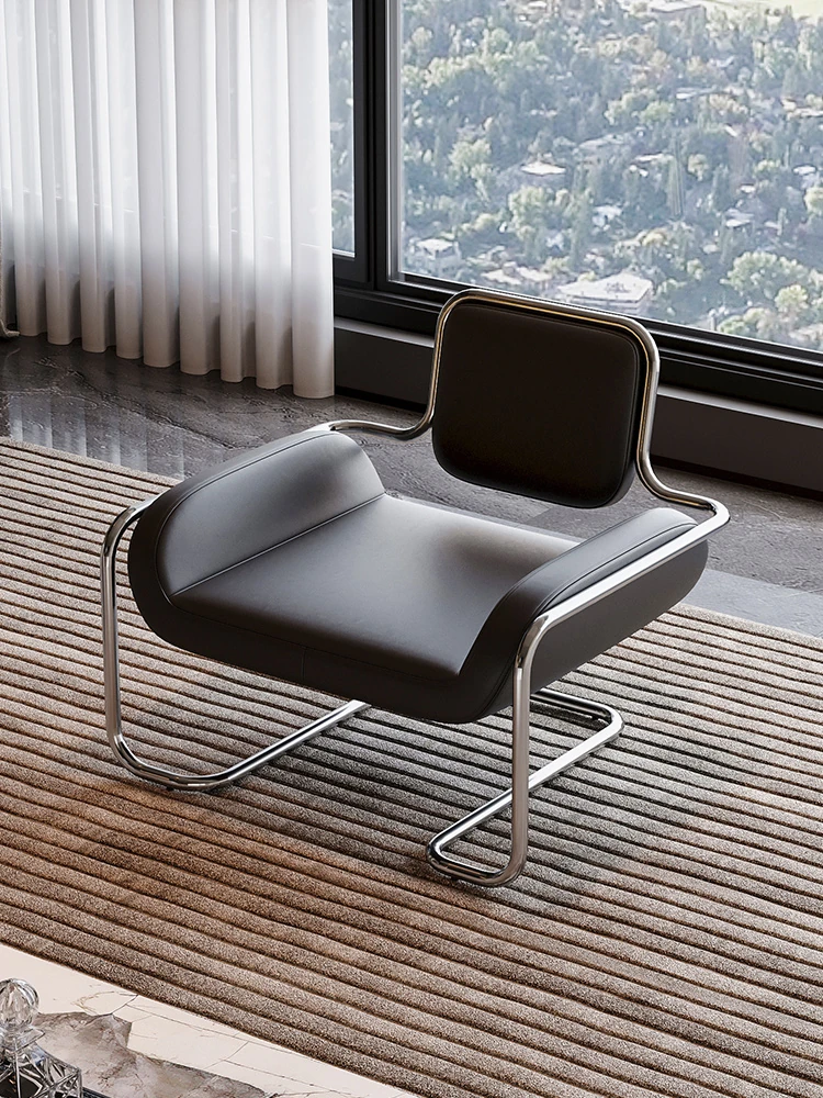 中古バウハウス風のカジュアルチェア - ステンレス製のユニークなデザイン、モダンでラグジュアリーな雰囲気。シックなブラック・ホワイト・グレーの配色で、リビングルームに最適な一人用ソファ。