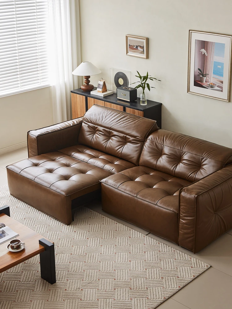 木目油ワックスレザー製トースト型電動機能付きレトロ貴妃ソファ - 高級牛革使用、伸縮自在で快適なリビングルーム用ソファベッド。あなたの家にスタイリッシュな癒し空間を!
