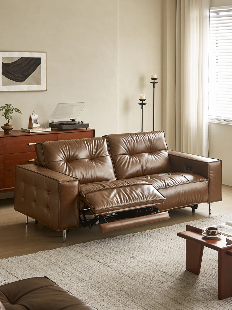 Vintage-Style Electric Leather Sofa with Waxed Finish - Retro Genuine Leather, Adjustable Brown Furniture for Living Room - Perfect for Enhancing Your Home Décor