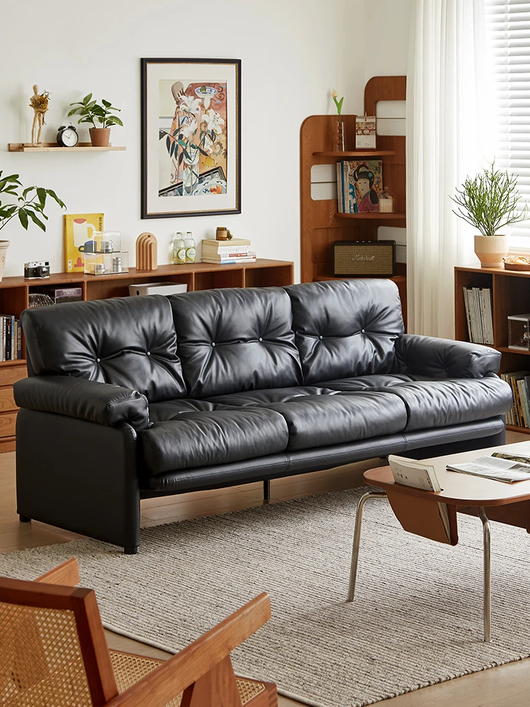 ZhiHuaShi Retro Cloud Sofa - 2025 New Arrival, Genuine Leather & Semi-Aged Leather, Large Black Cowhide Living Room Sofa Model 3176B