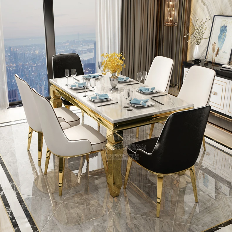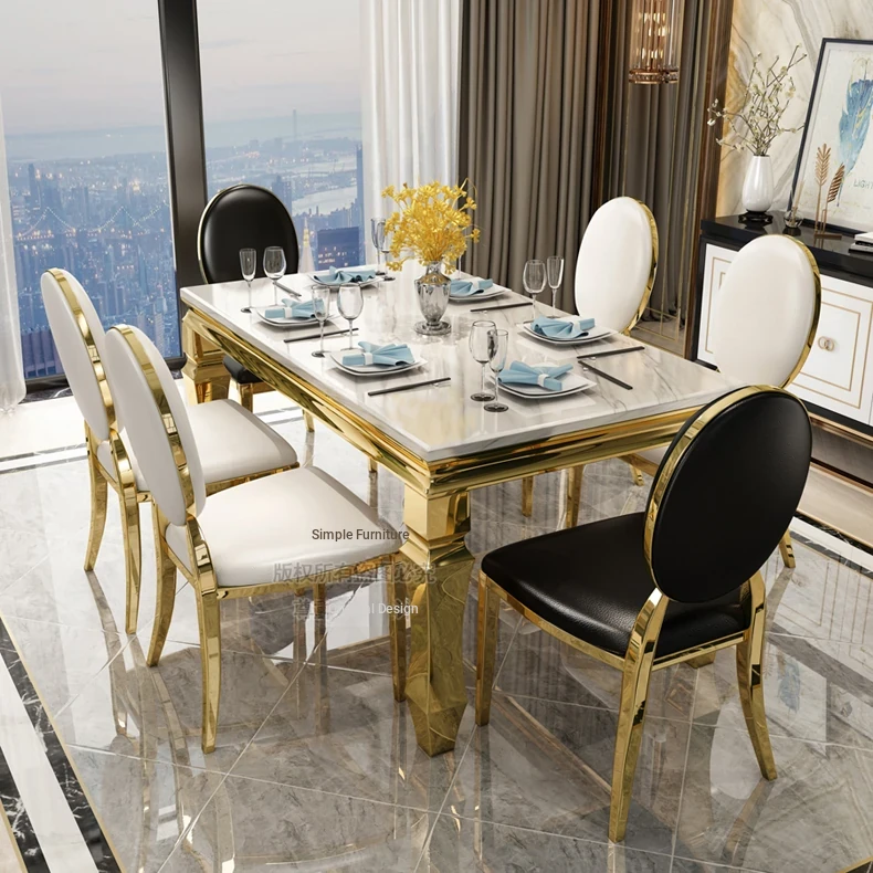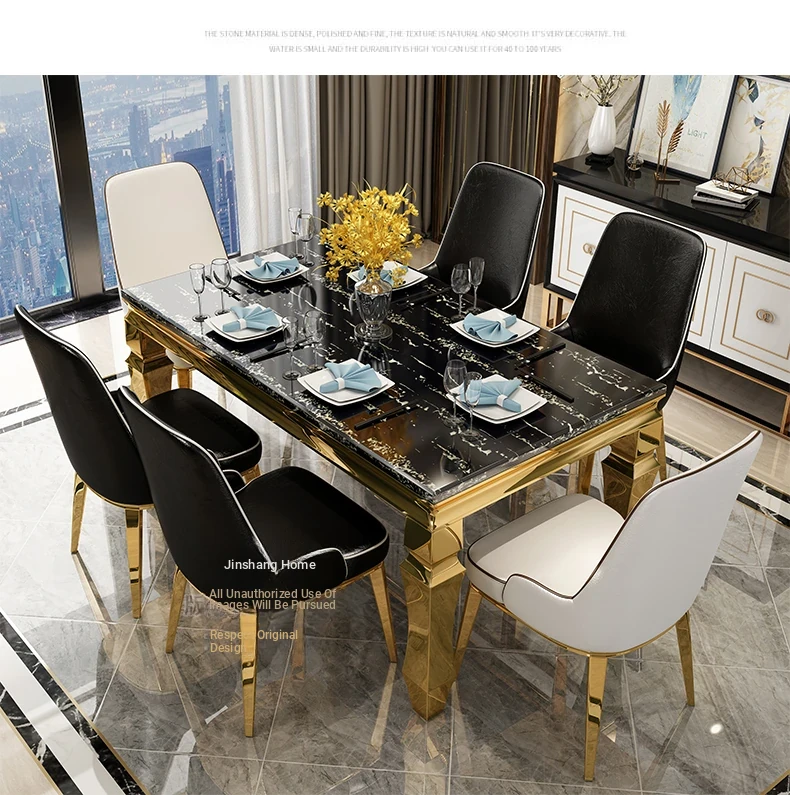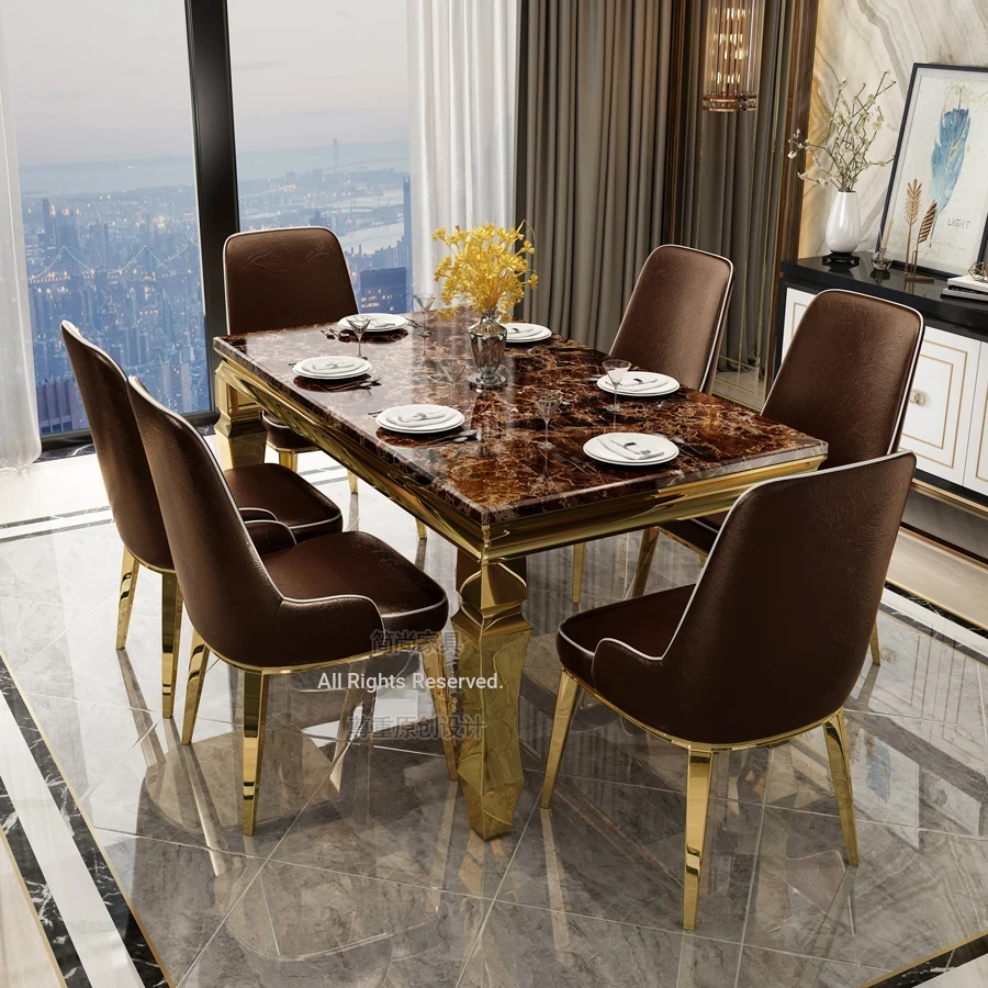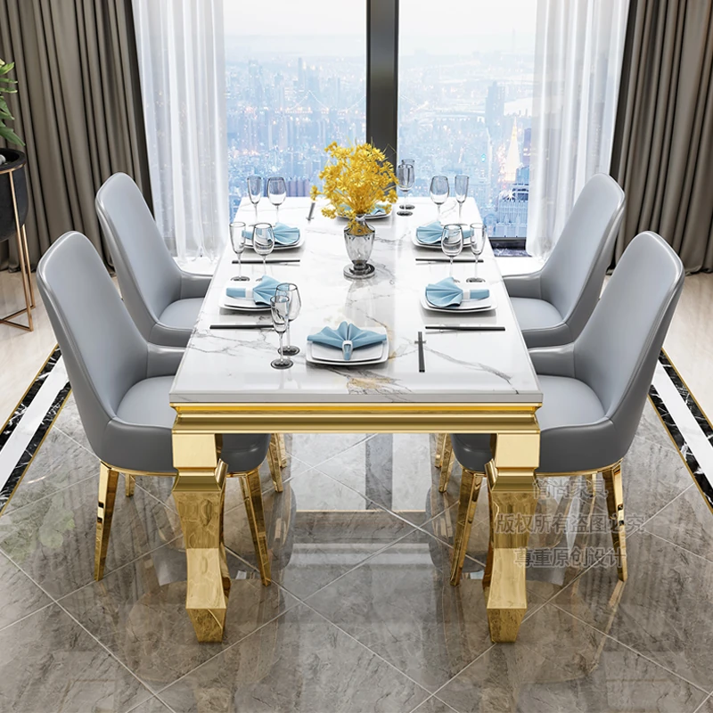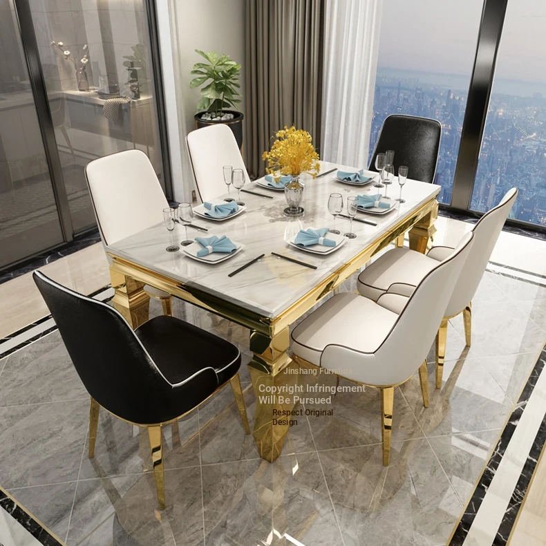 Modern Minimalist Light Luxury Marble Dining Table Set for Small Spaces - Rectangular Stainless Steel Table and Chairs for 6 People, Perfect for Your Living Room