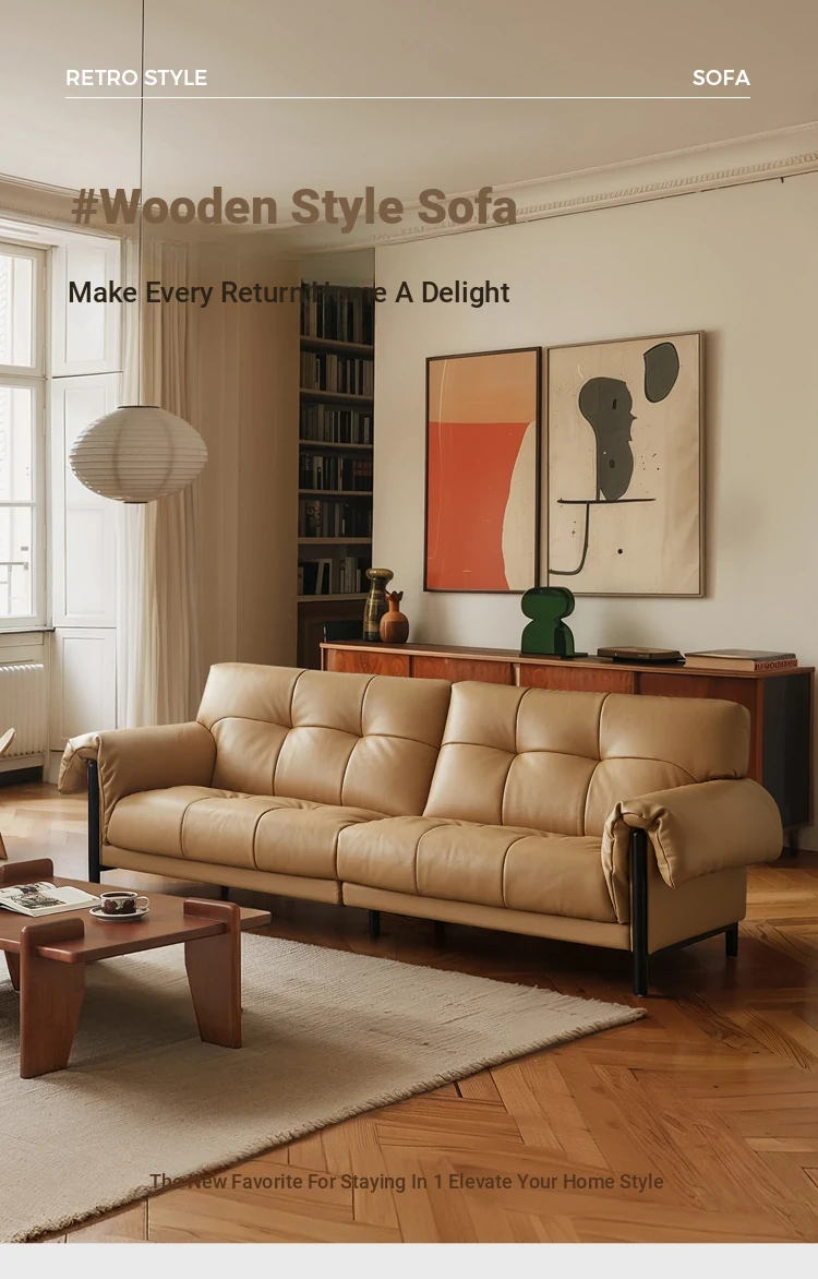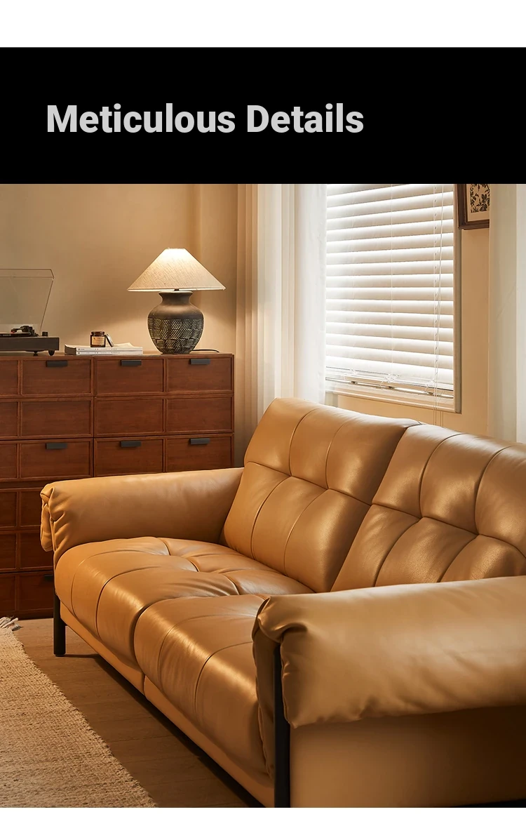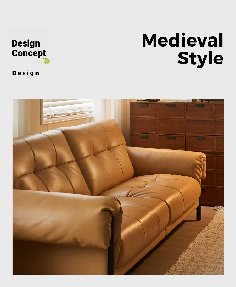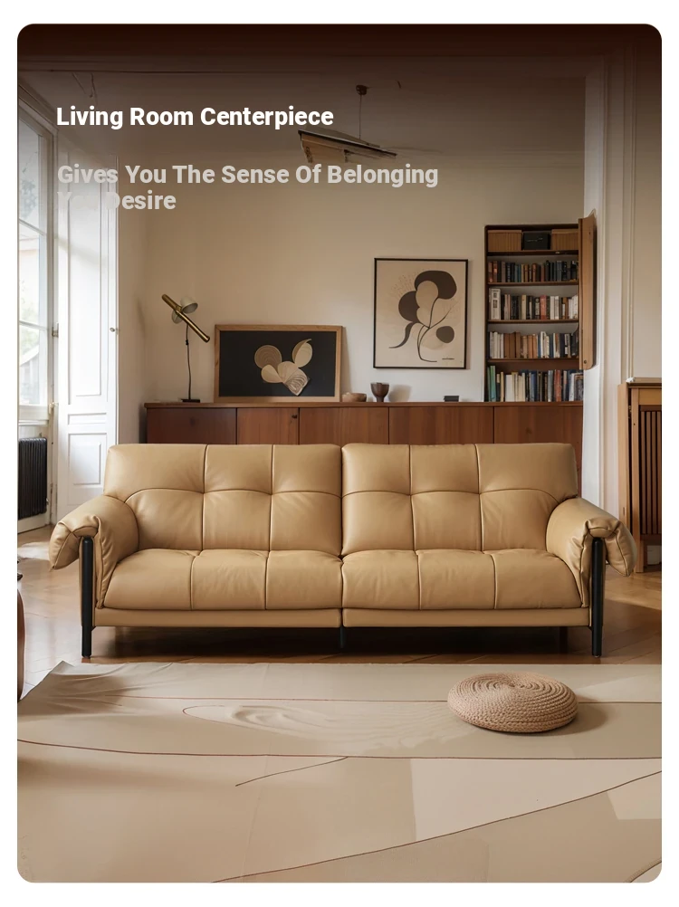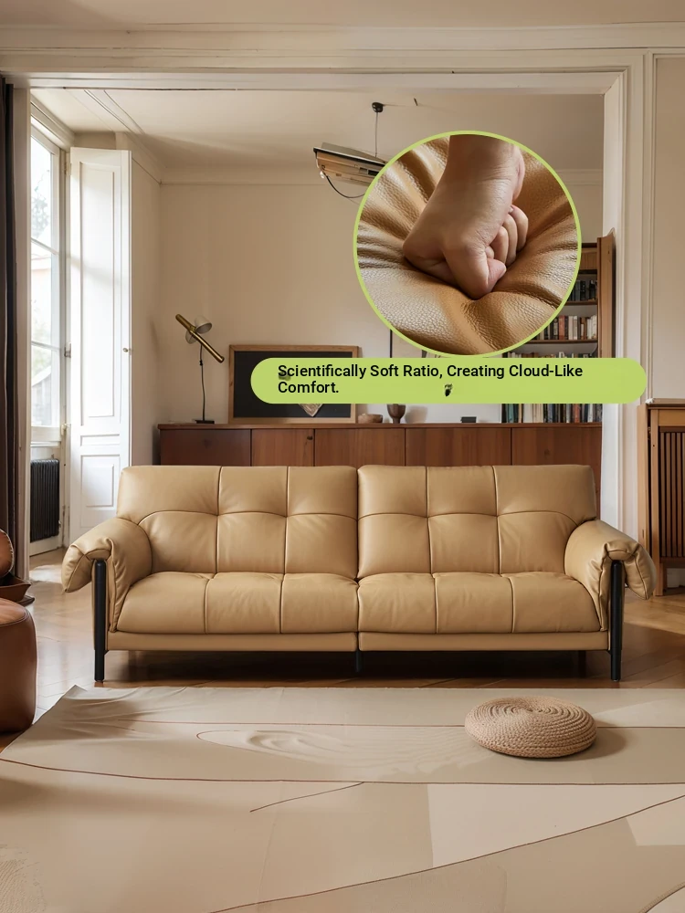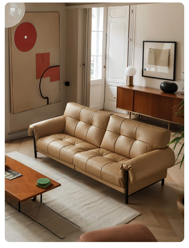 Vintage French Style Cracked Leather Three-Seater Sofa - Authentic Top Grain Cowhide Living Room Couch with Antique Charm
