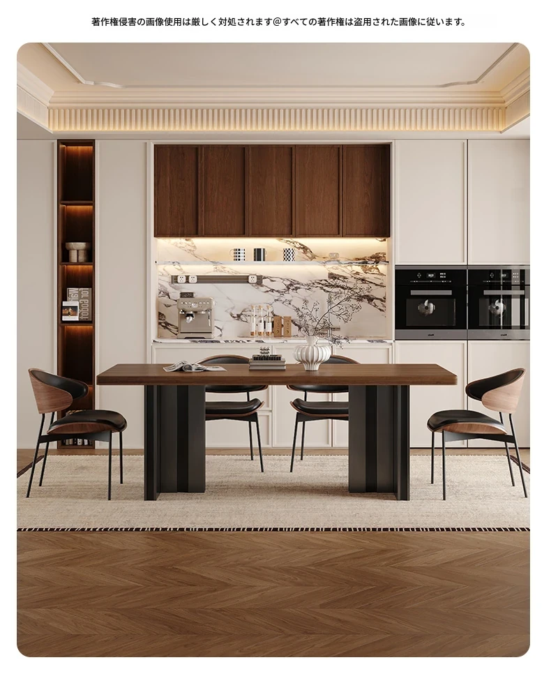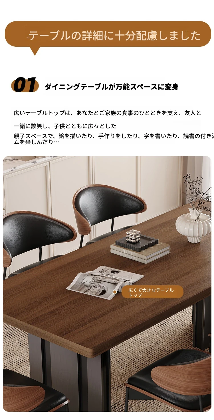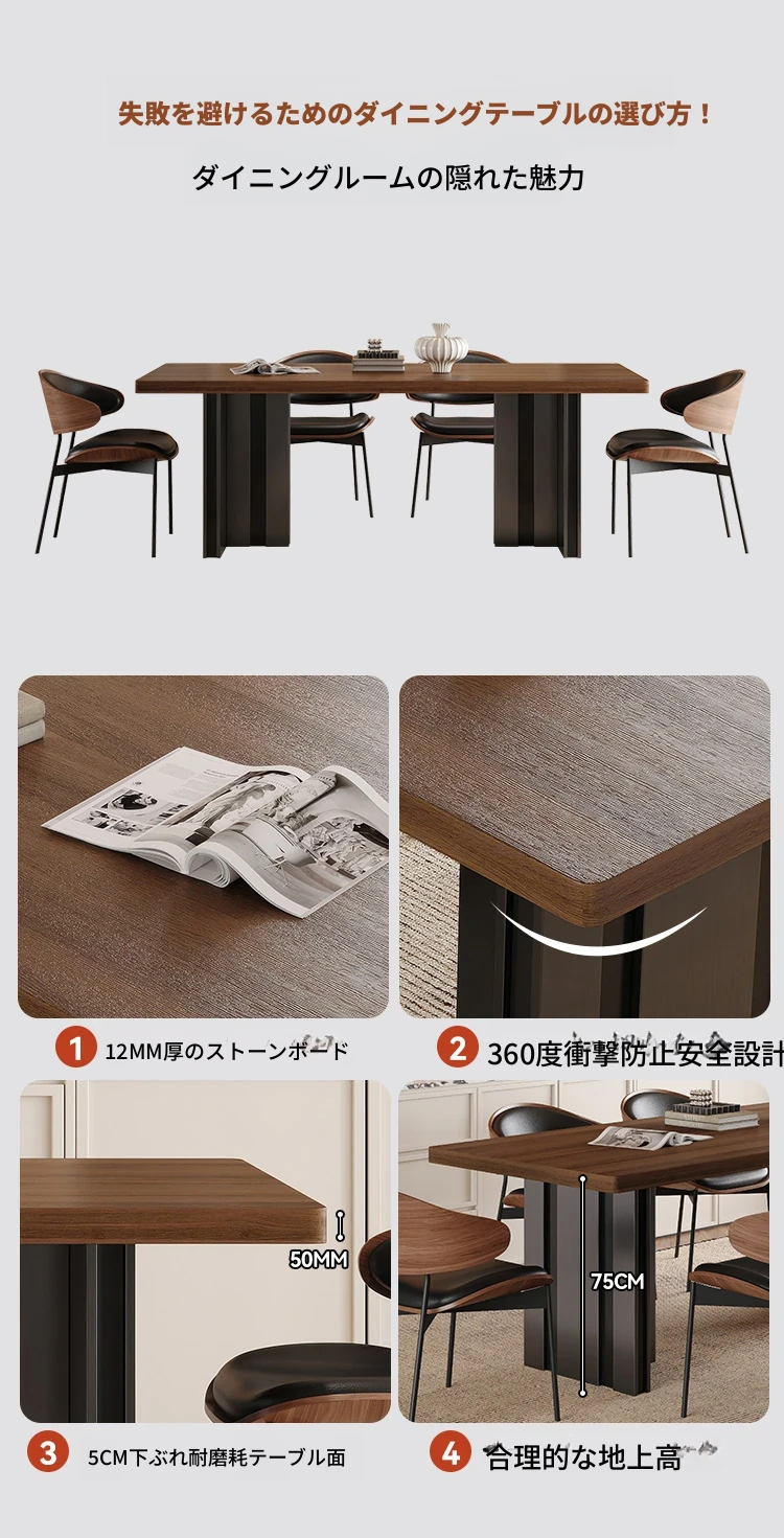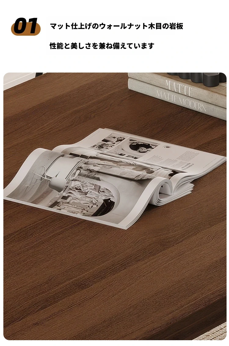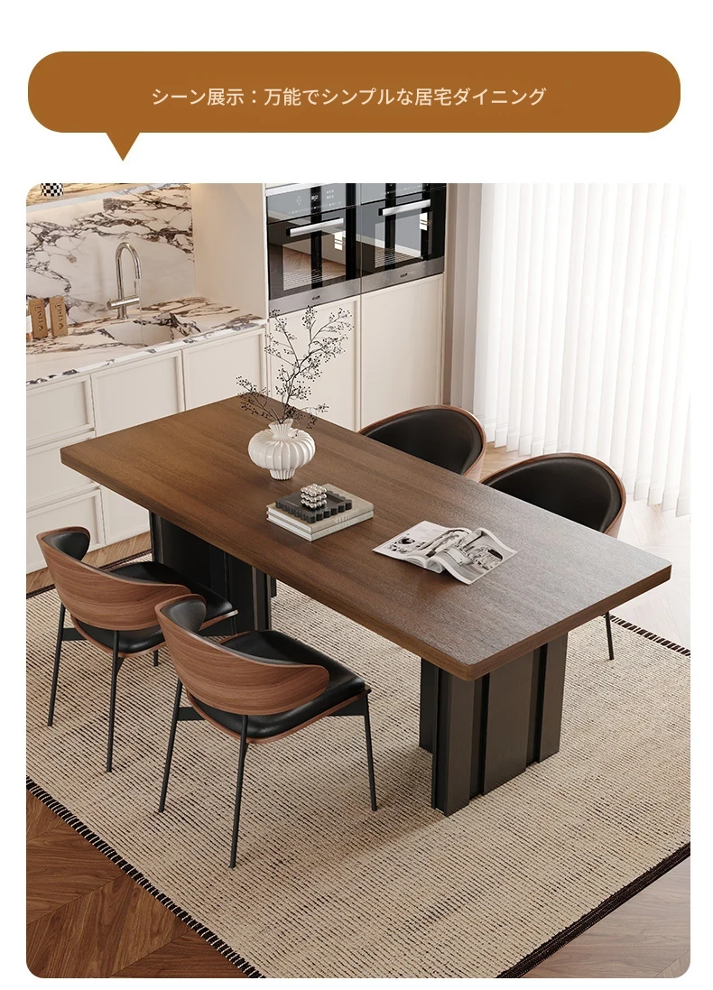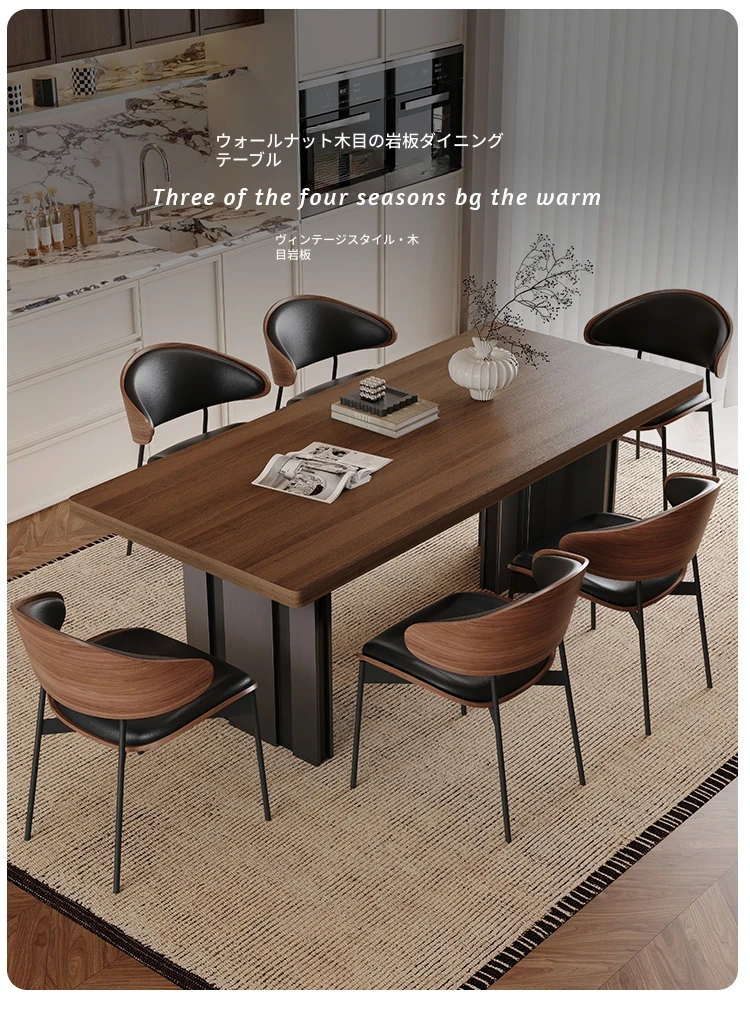 2025年新作!高級感溢れる胡桃色木目調のロックボードダイニングテーブル - ヴィンテージ風の長方形デザインで、おしゃれなリビングにぴったり!下掛けスタイルでスッキリ収納も実現!