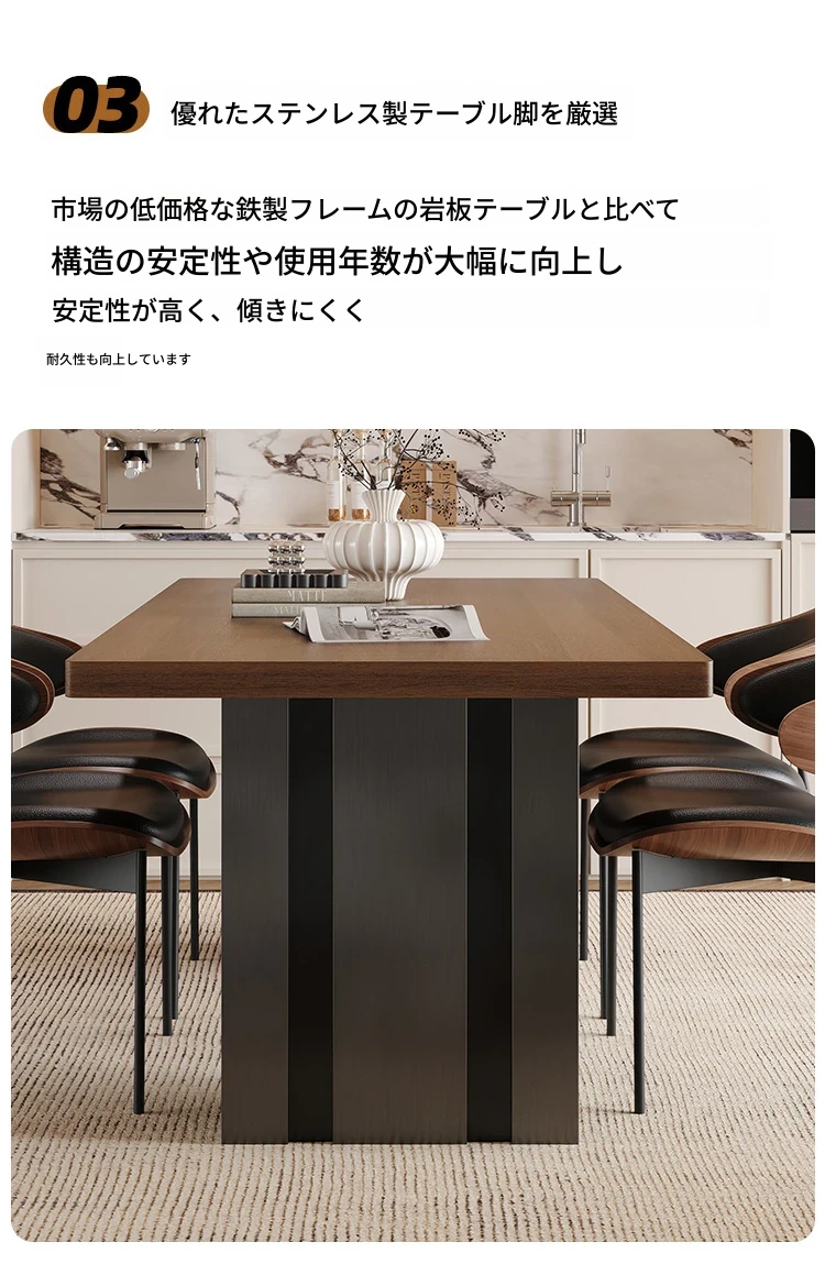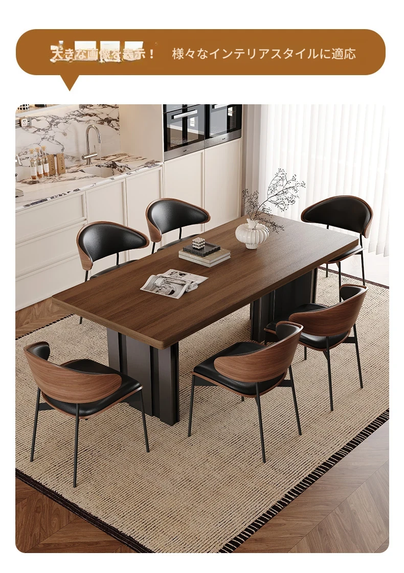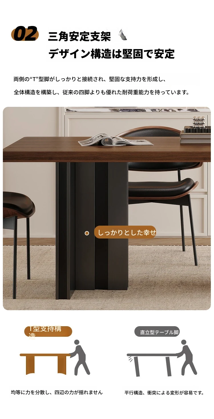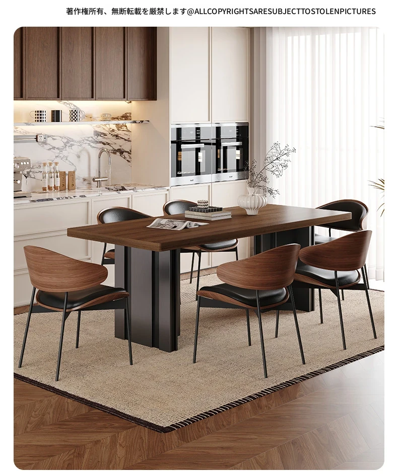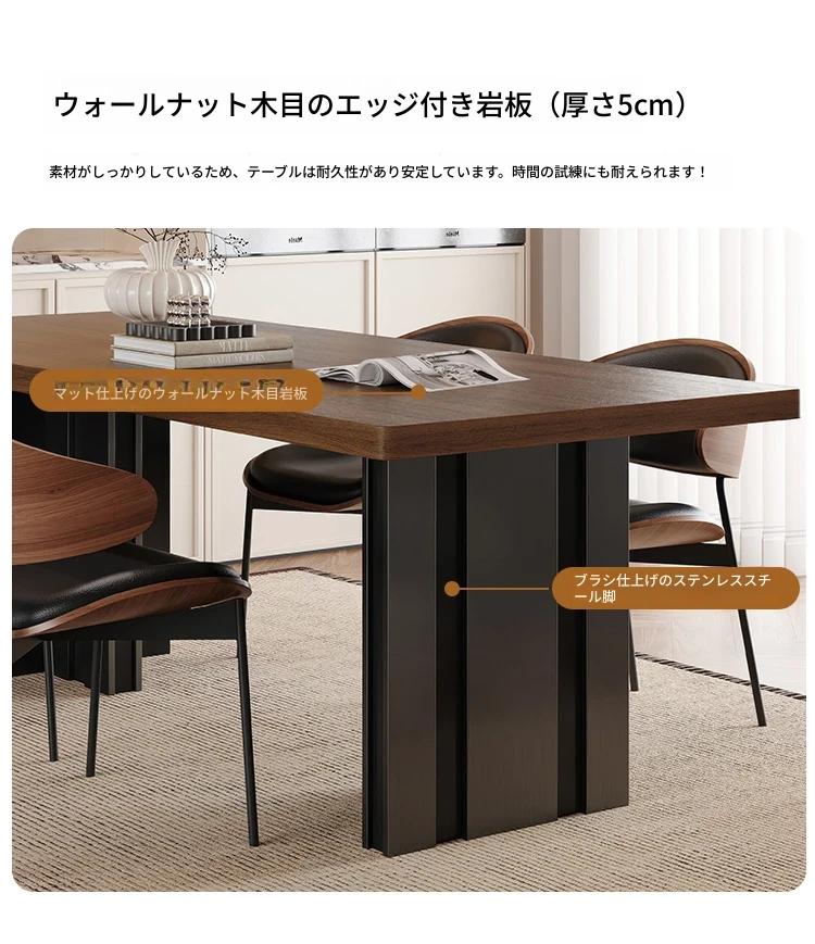 2025年新作!高級感溢れる胡桃色木目調のロックボードダイニングテーブル - ヴィンテージ風の長方形デザインで、おしゃれなリビングにぴったり!下掛けスタイルでスッキリ収納も実現!