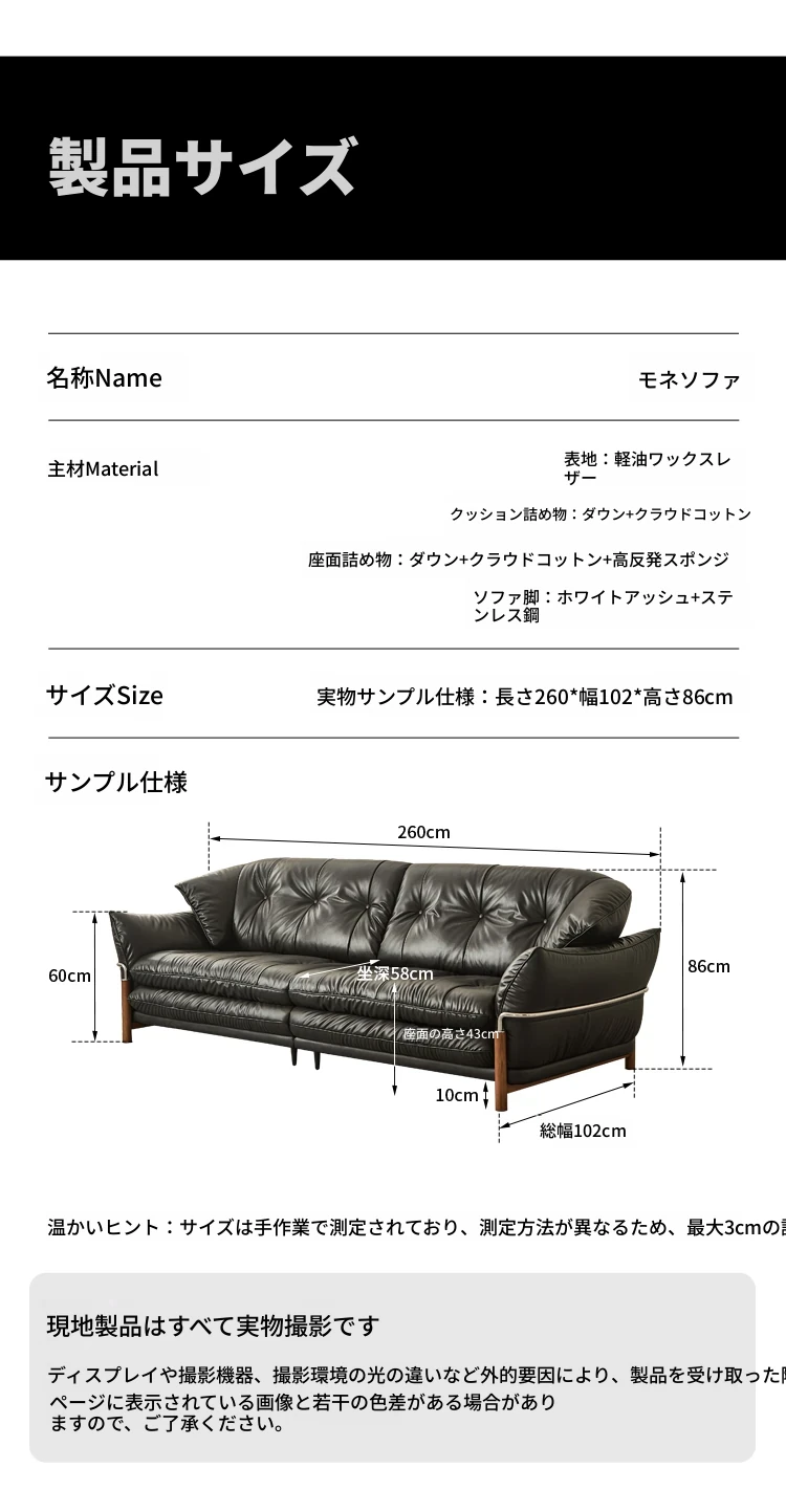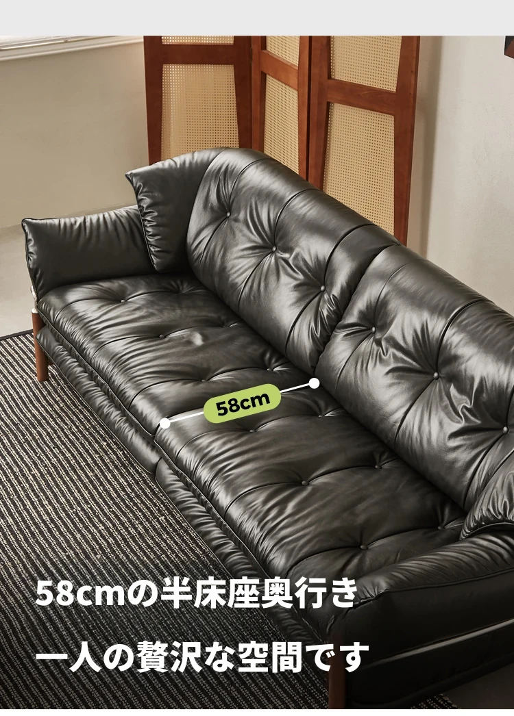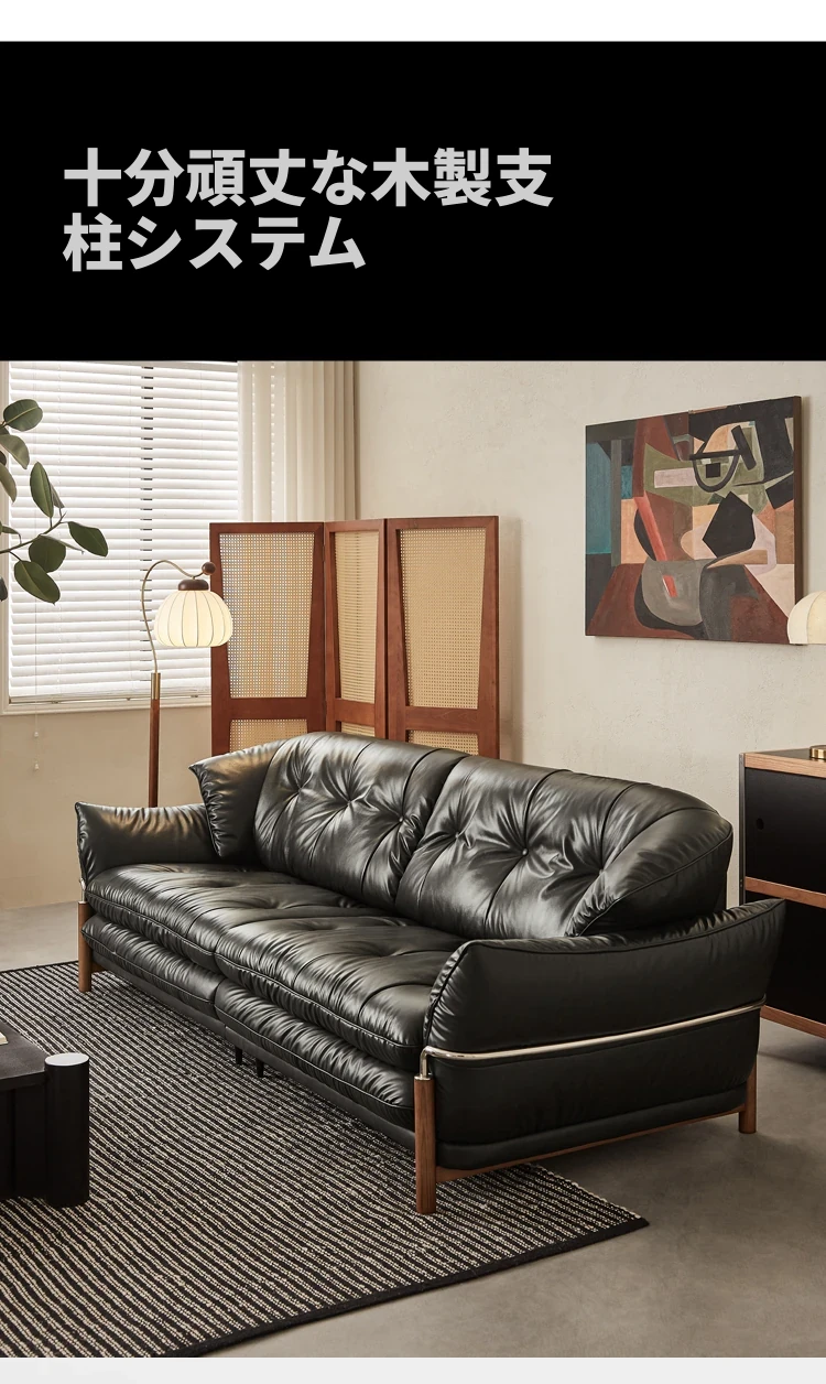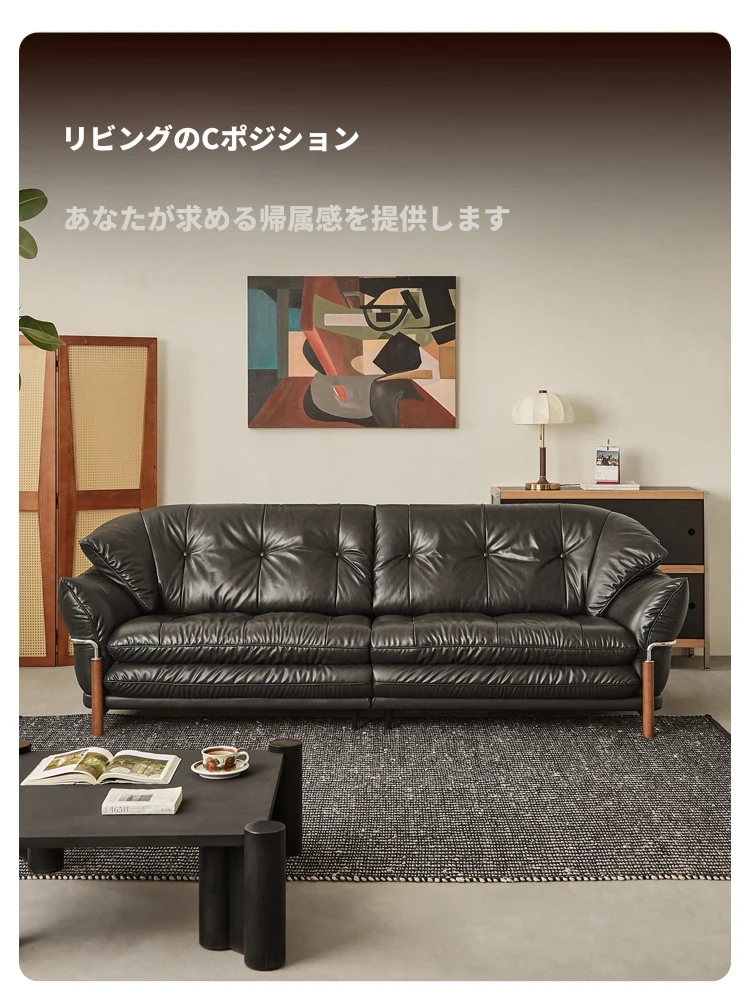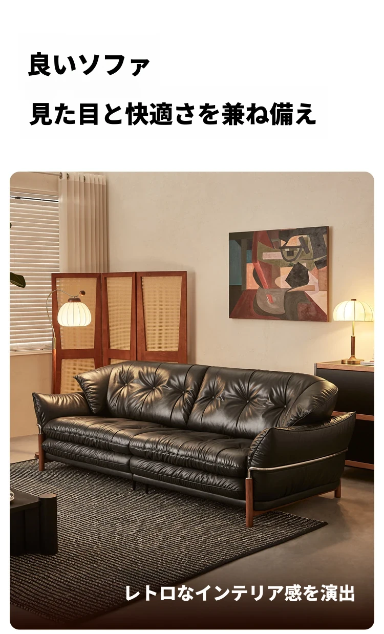 モクモク家具 モネ風レトロオイルワックスレザーソファ フランスのアンティークスタイル ブラック本革ストレートリビングソファ 新作登場!おしゃれで高級感溢れるデザインで、あなたのリビングを華やかに演出します。