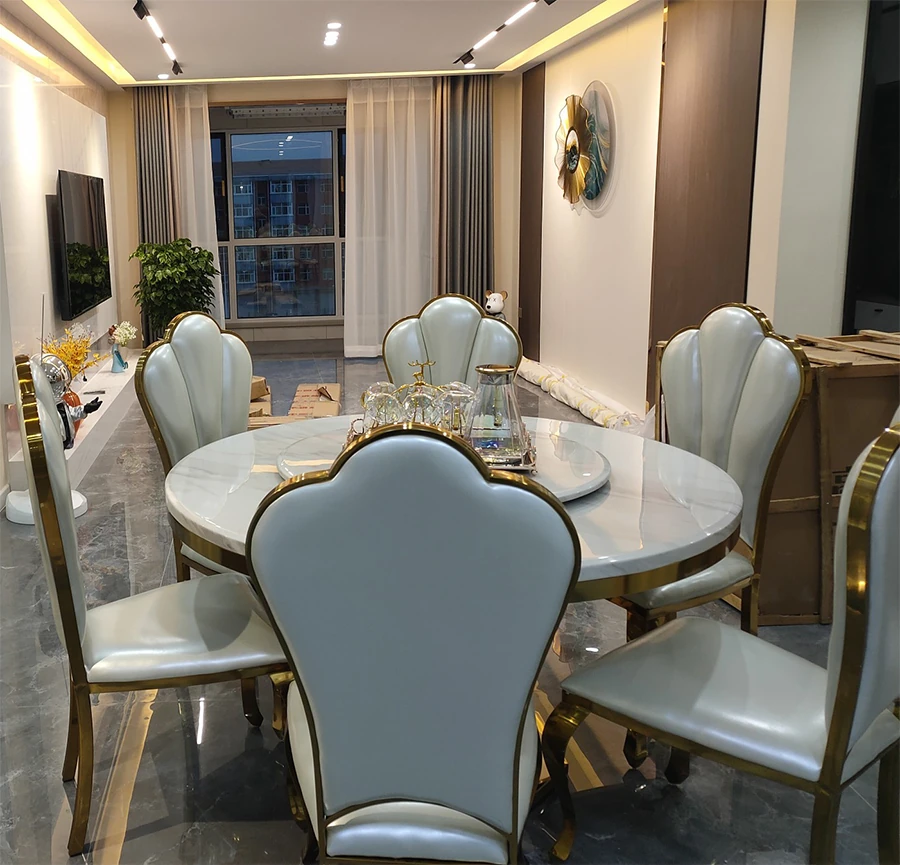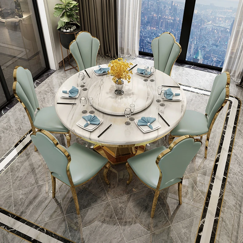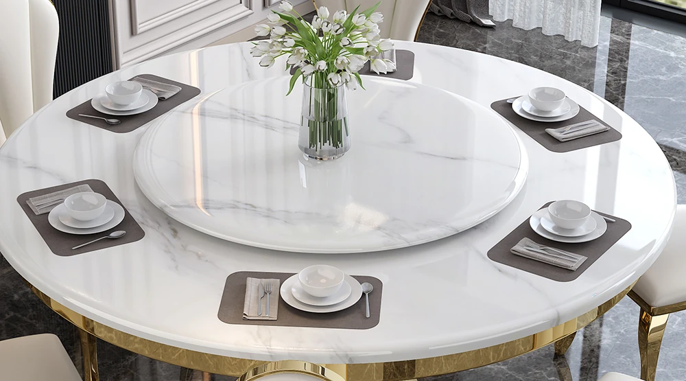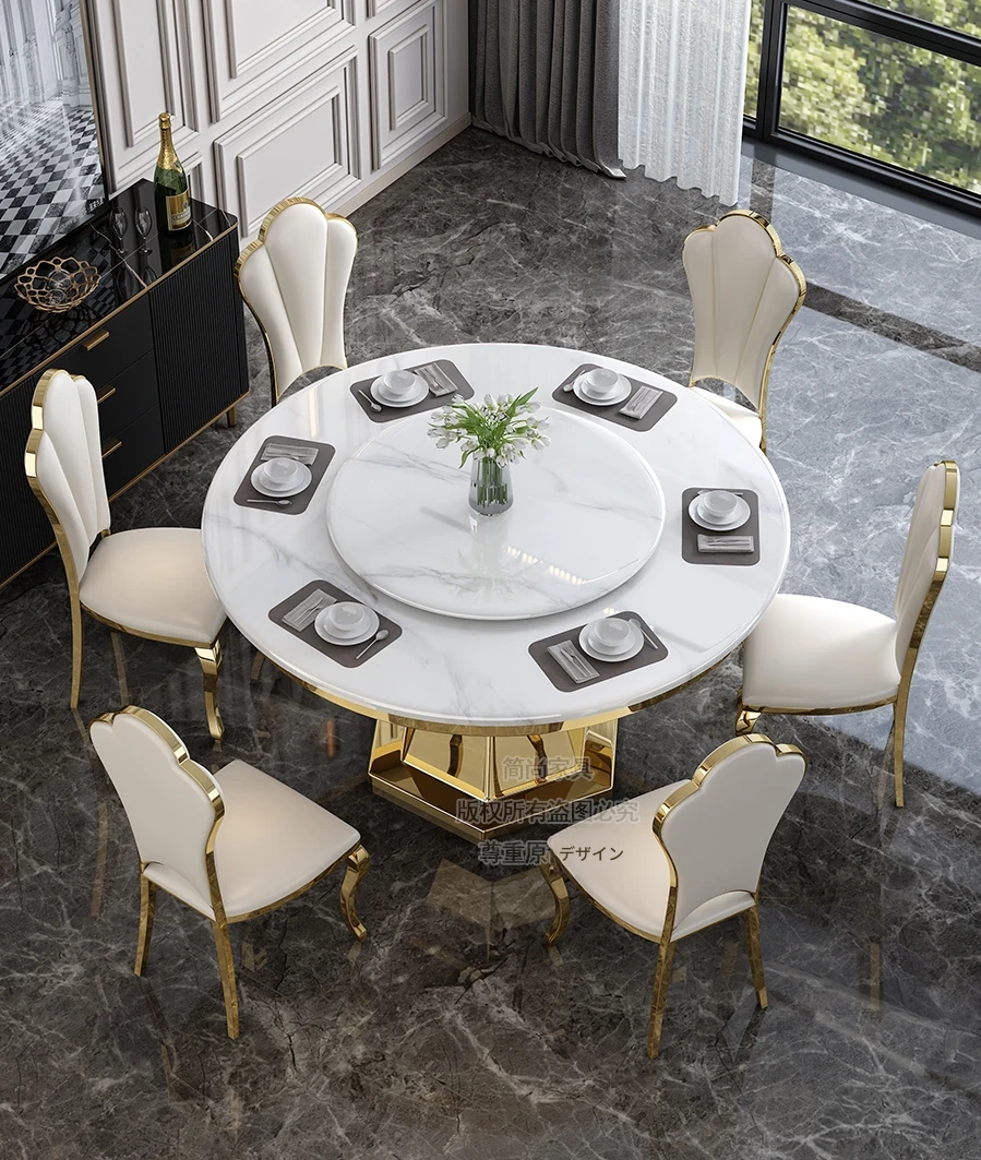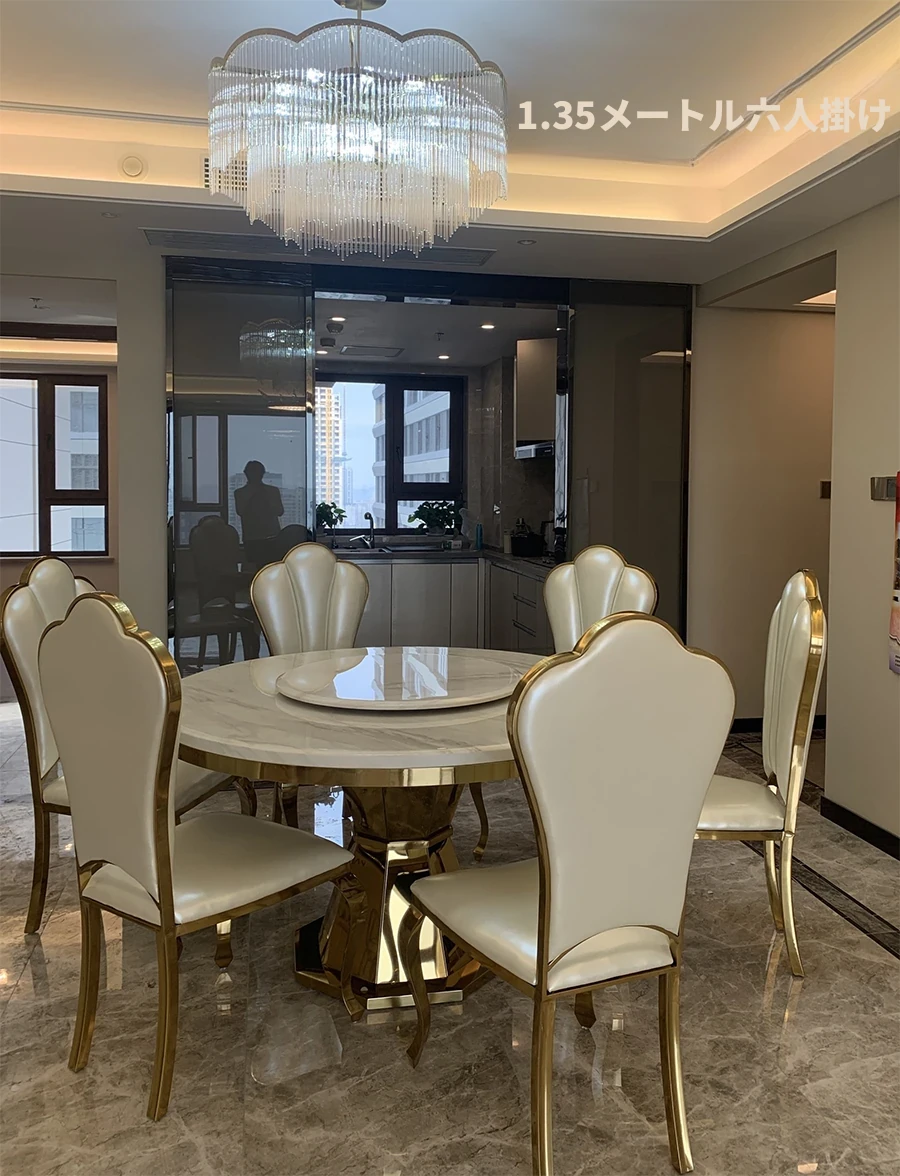 高級感あふれる大理石のダイニングテーブルセット!モダンでシンプルなデザイン、回転式の円形テーブルが特徴。家族や友人との特別な時間を演出する、広々としたヴィラや大邸宅にぴったりのアイテムです。
