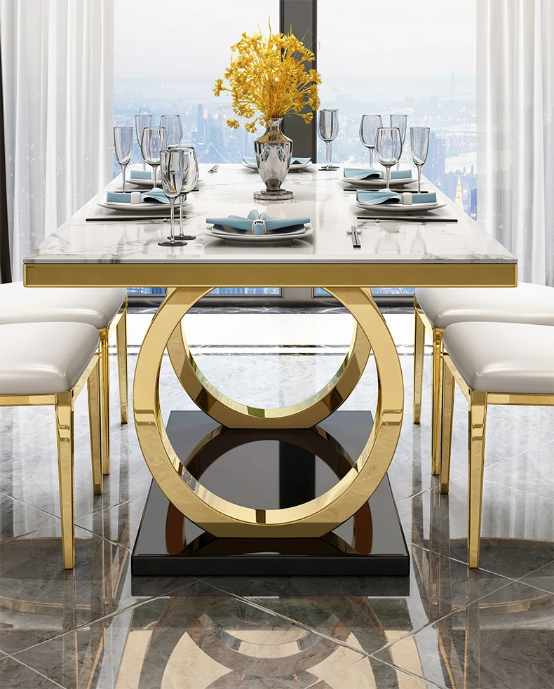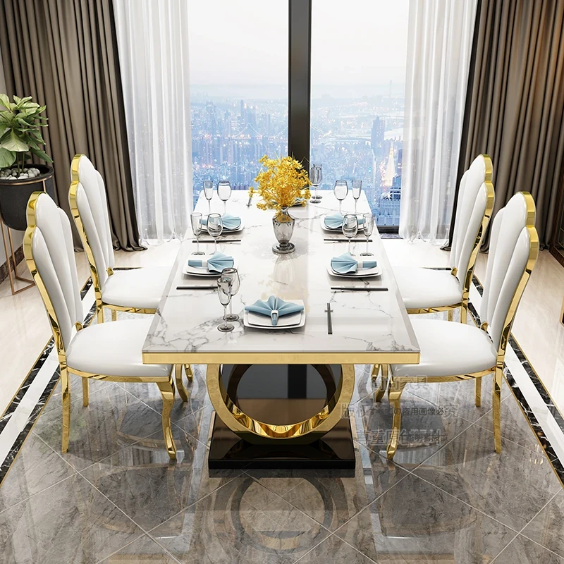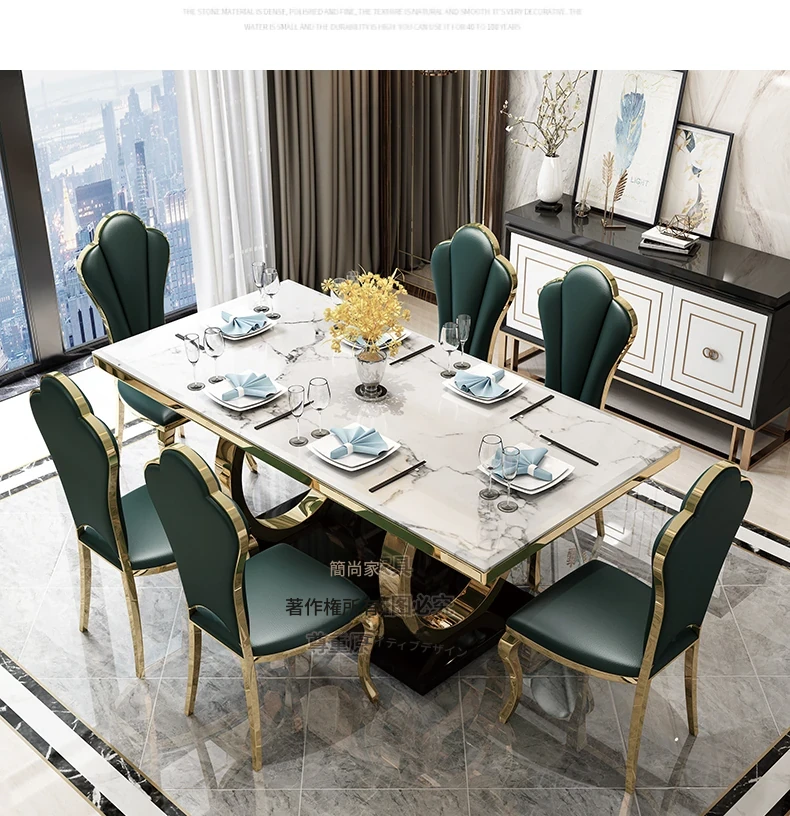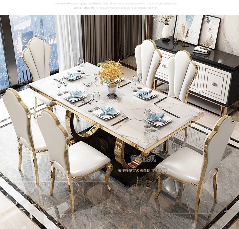 軽やかなラグジュアリー、モダンなシンプルデザインの大理石ダイニングテーブルとチェアのセット。香港スタイルの大小様々なリビングにぴったりの長方形家庭用食卓。あなたの空間に洗練された美しさをプラス!