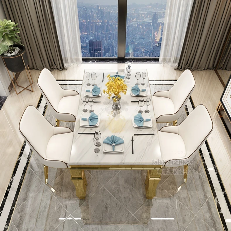ラグジュアリー感漂う大理石のダイニングテーブル!後現代風のシンプルデザインで、小さなリビングにもぴったり。6人用のステンレス製テーブル&チェアセットで、スタイリッシュな食事空間を演出します。