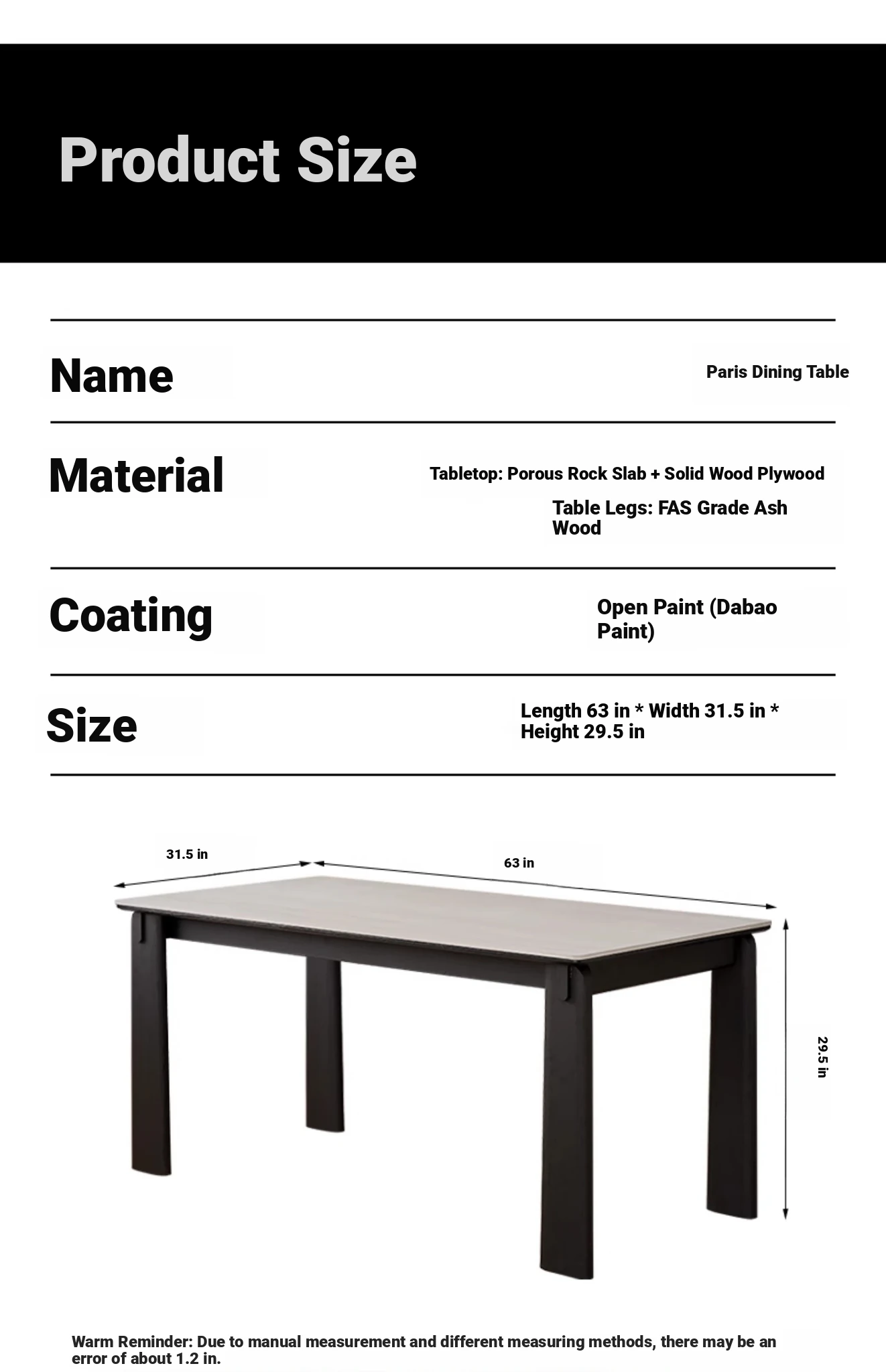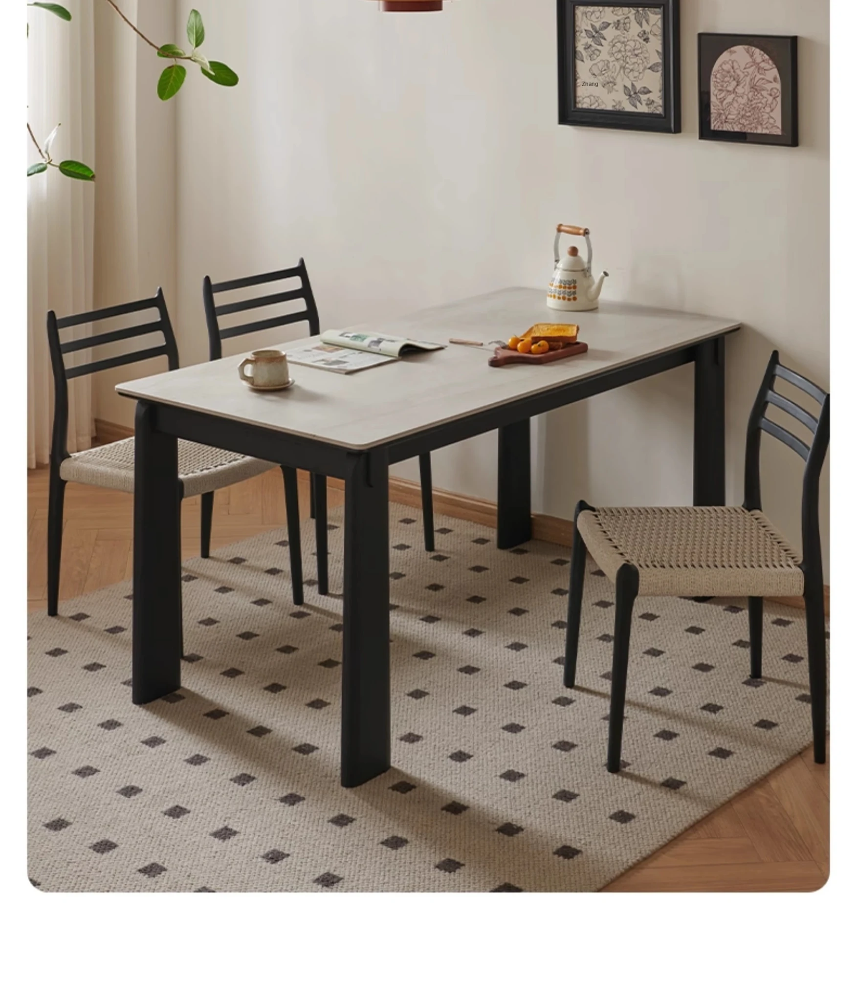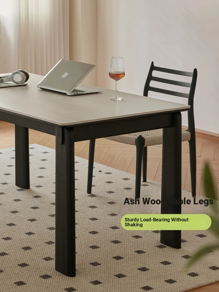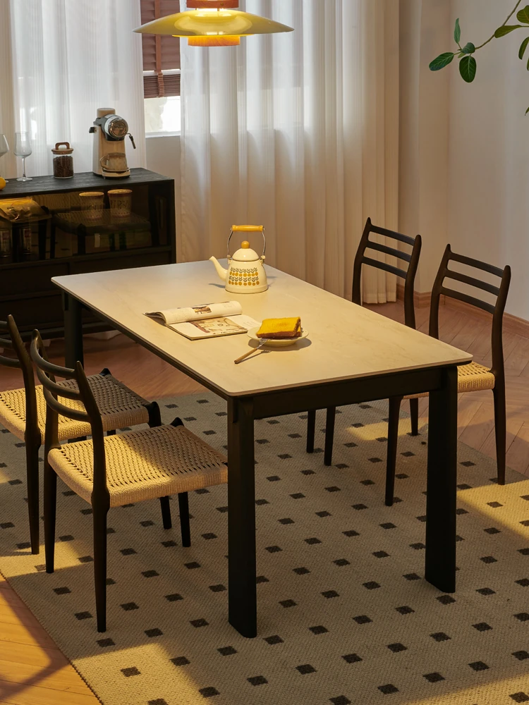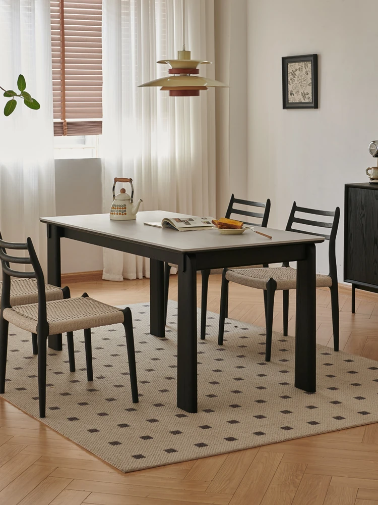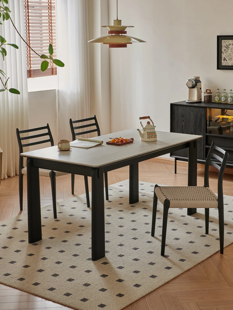 Parisian Style Black Solid Wood Dining Table with Stone Top - Vintage Rectangular Table for Small Homes, Perfect for Cozy Dining Spaces