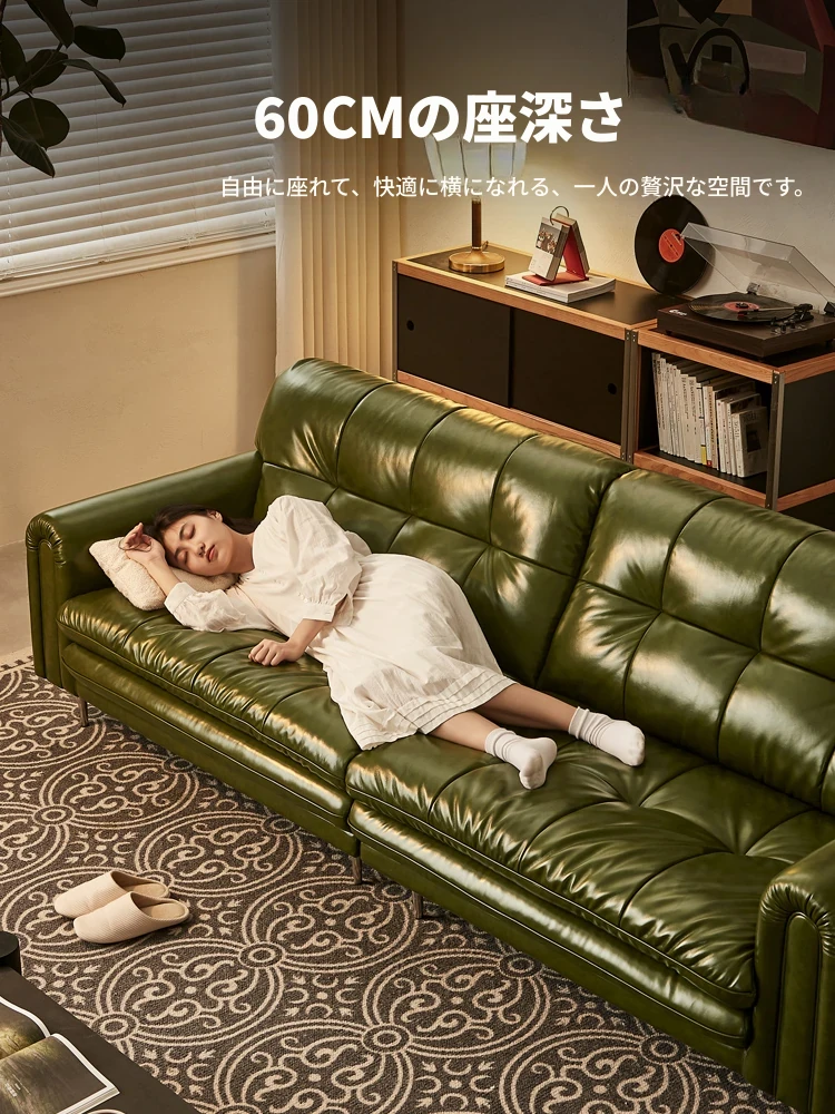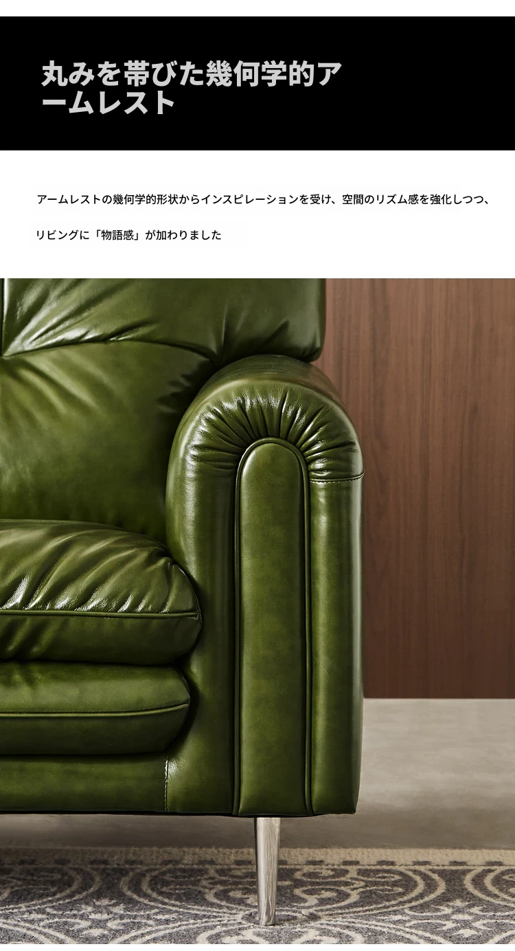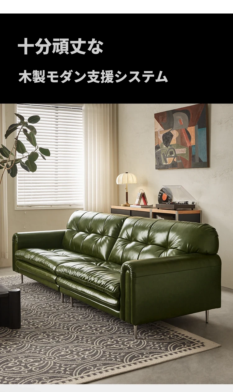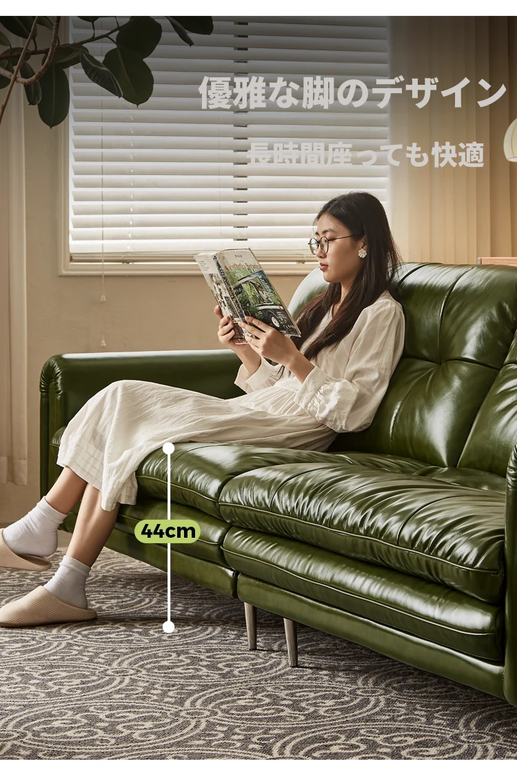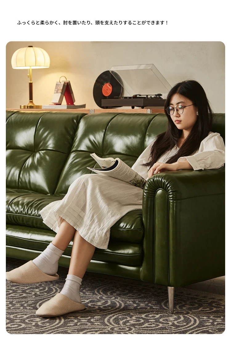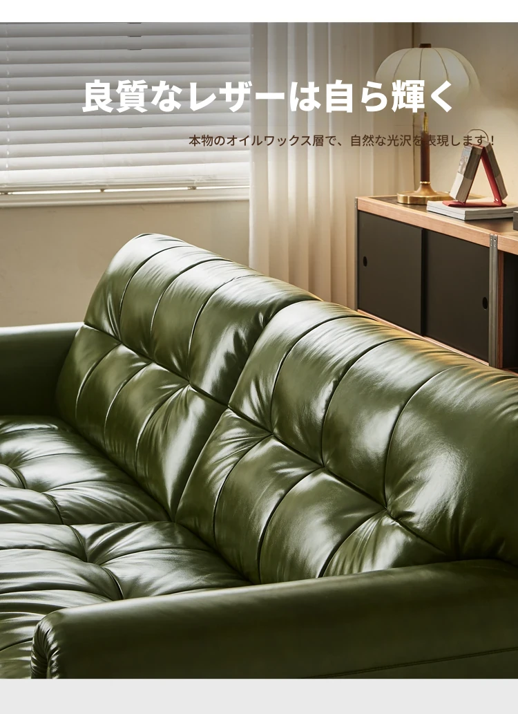 木陌家具のロックソファ - ヴィンテージオイルワックスレザー使用、真皮製。小型リビングに最適なグリーンのストレートソファ、2025年新作登場!おしゃれで快適な空間を演出します。