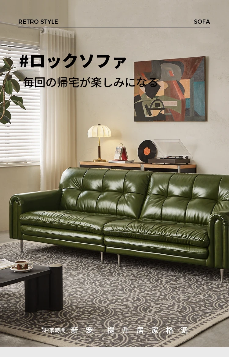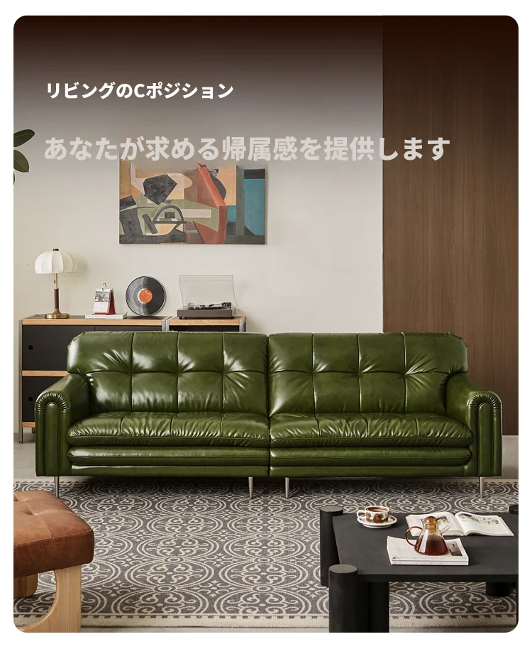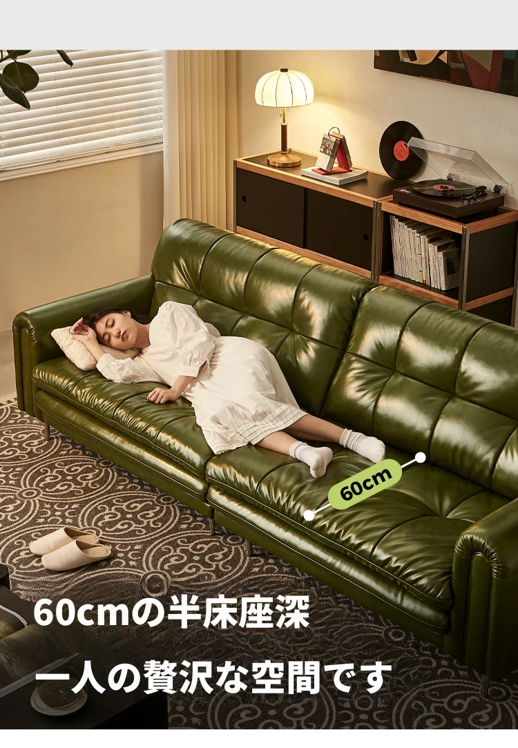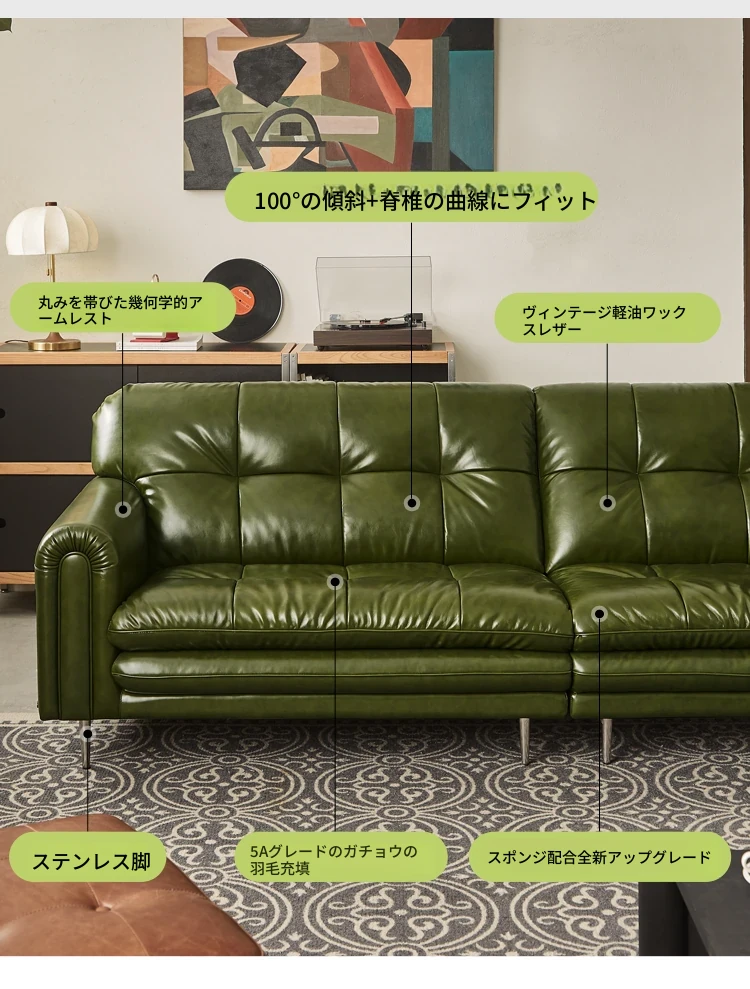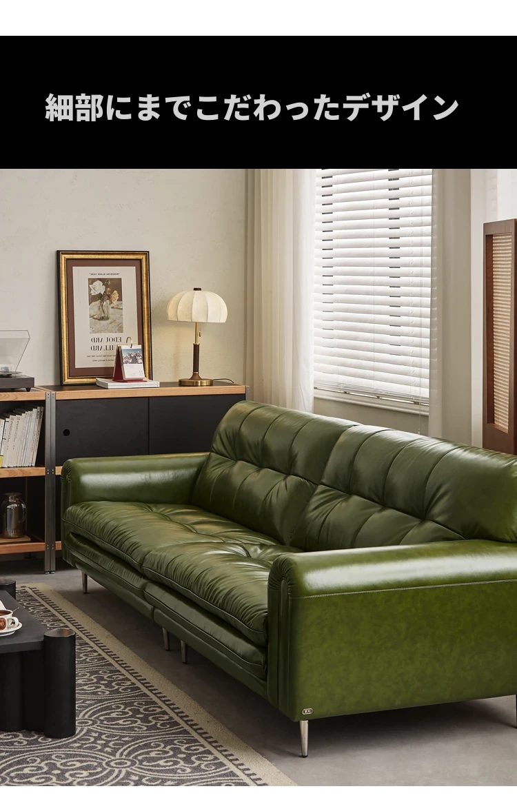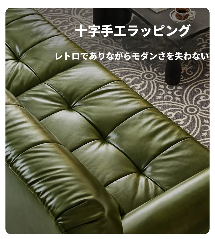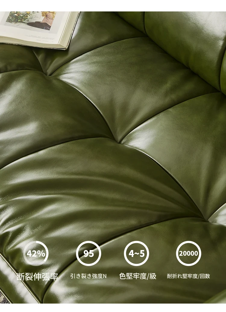 木陌家具のロックソファ - ヴィンテージオイルワックスレザー使用、真皮製。小型リビングに最適なグリーンのストレートソファ、2025年新作登場!おしゃれで快適な空間を演出します。