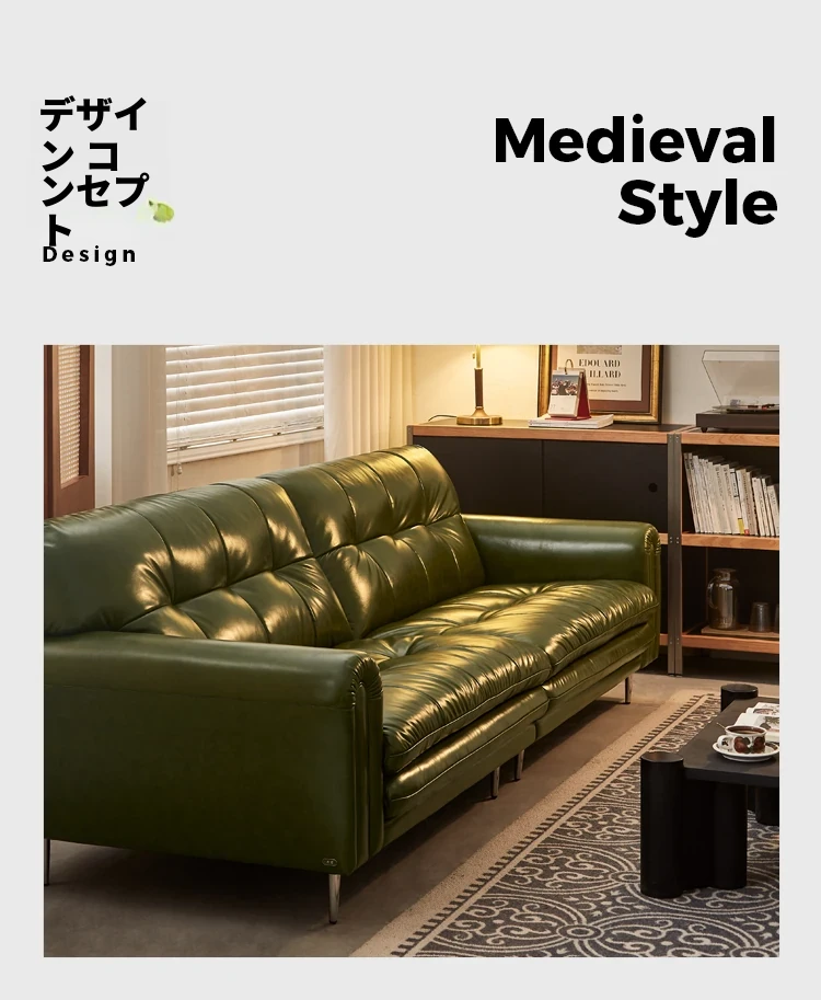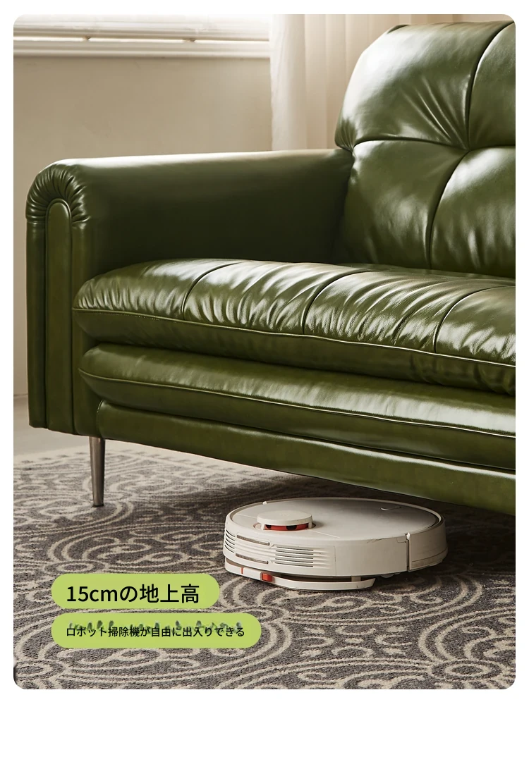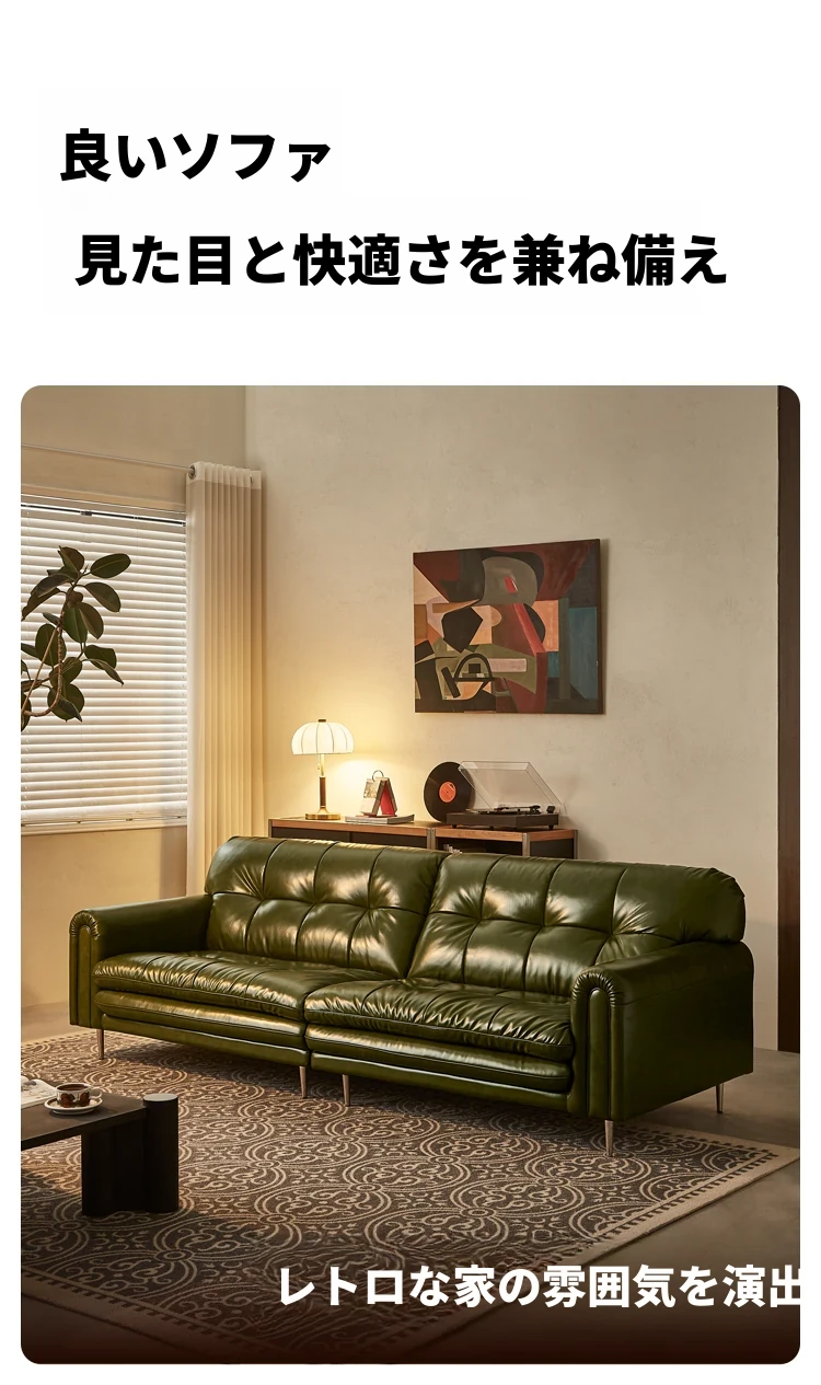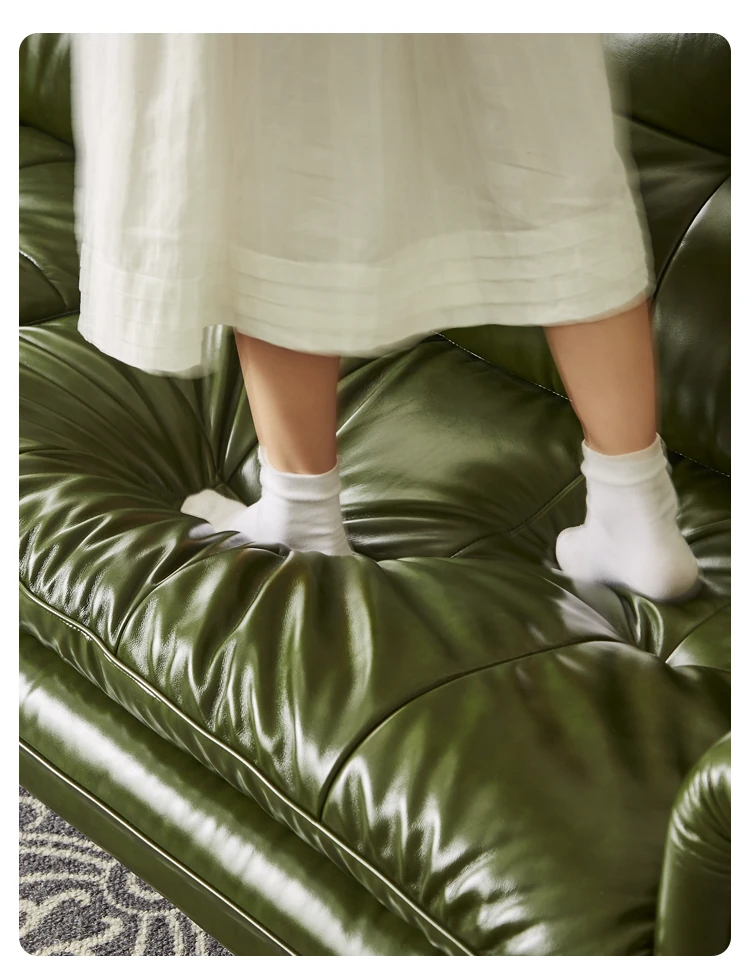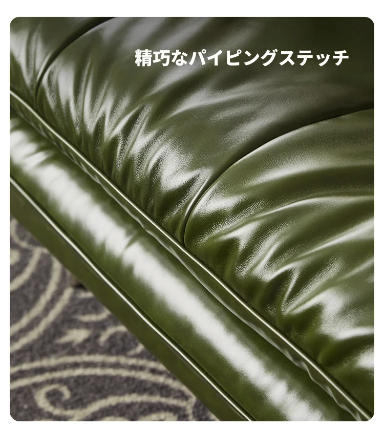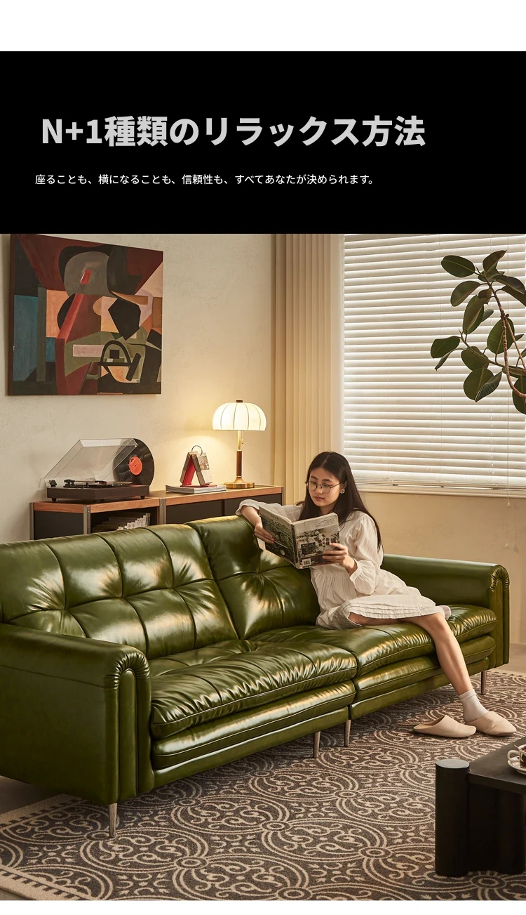 木陌家具のロックソファ - ヴィンテージオイルワックスレザー使用、真皮製。小型リビングに最適なグリーンのストレートソファ、2025年新作登場!おしゃれで快適な空間を演出します。
