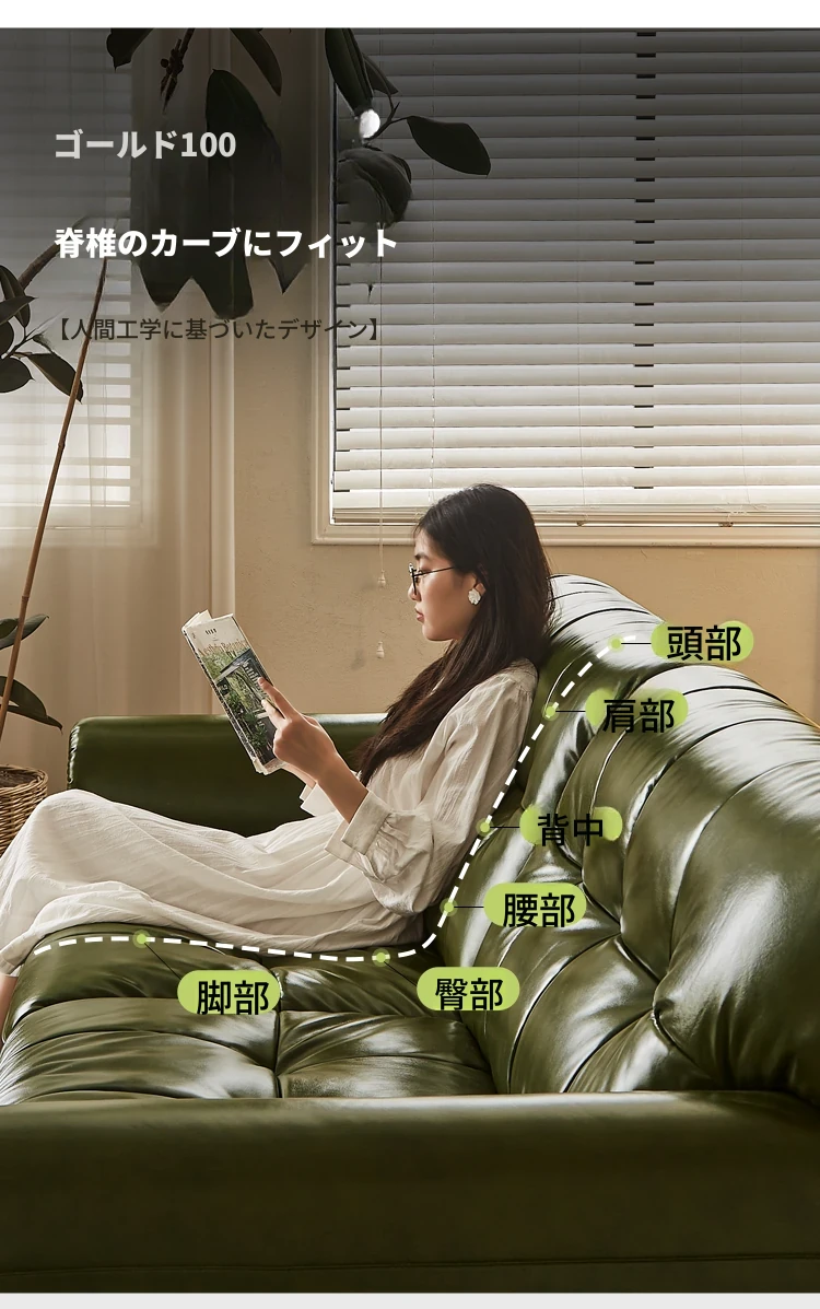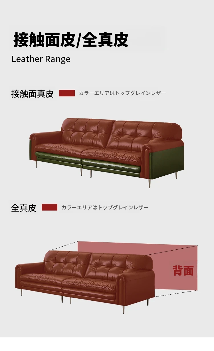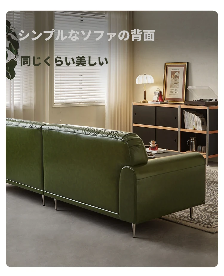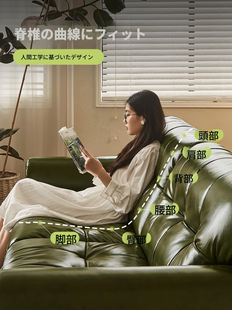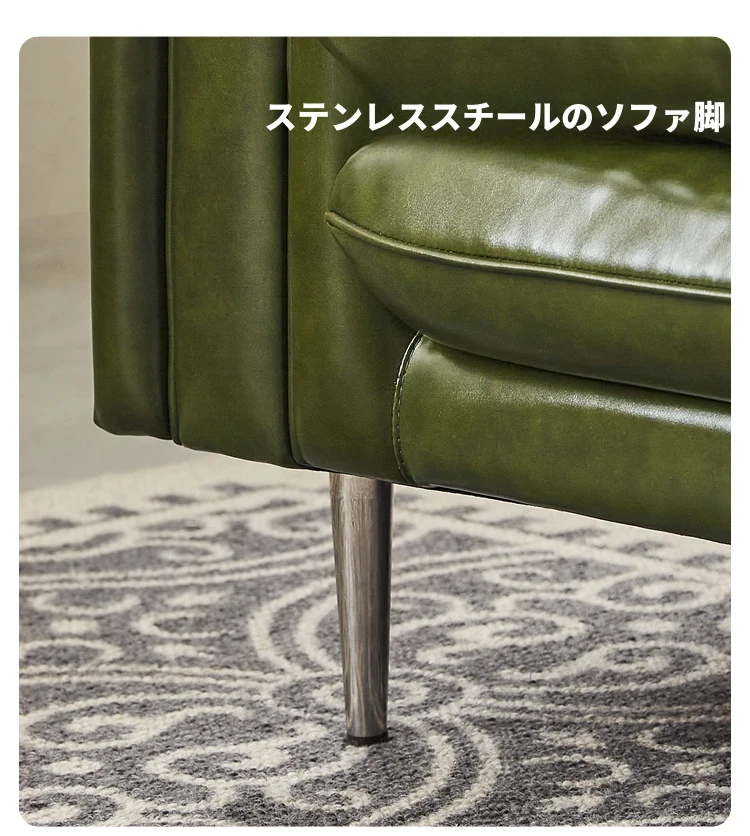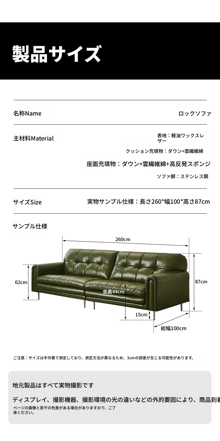 木陌家具のロックソファ - ヴィンテージオイルワックスレザー使用、真皮製。小型リビングに最適なグリーンのストレートソファ、2025年新作登場!おしゃれで快適な空間を演出します。