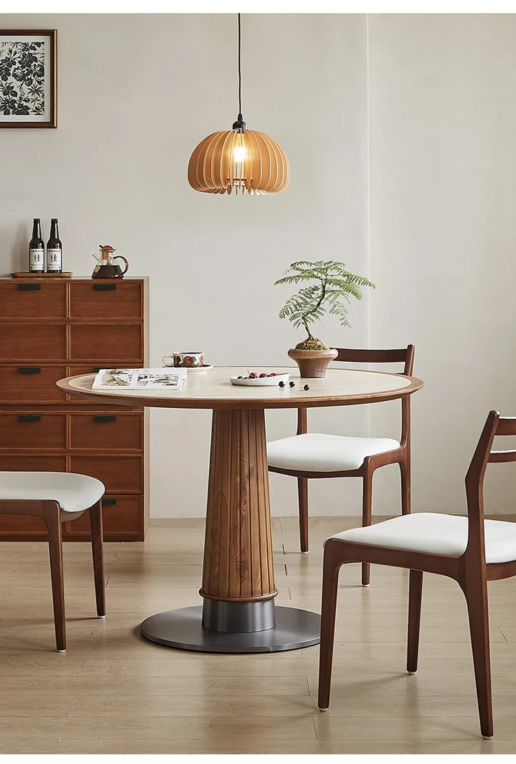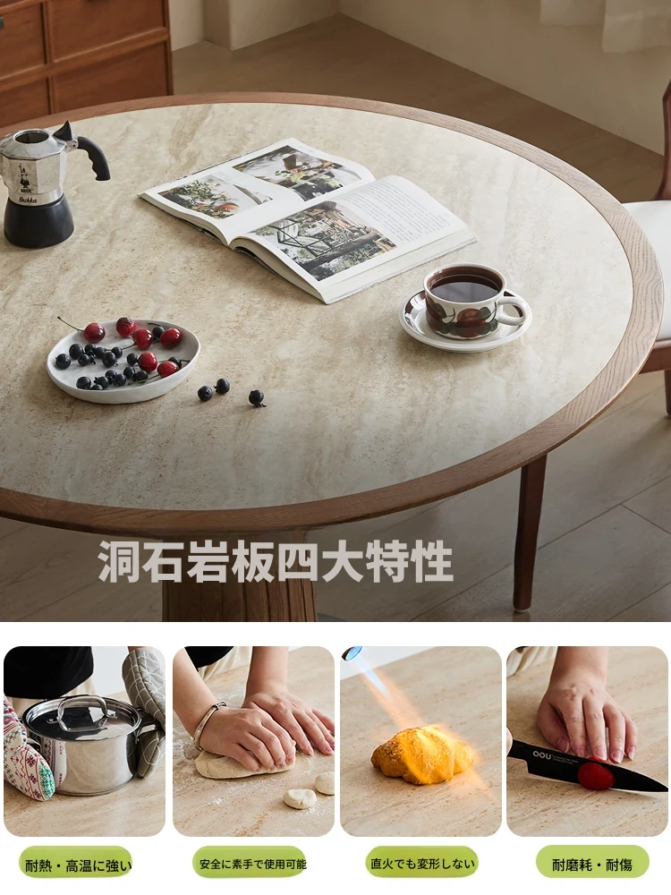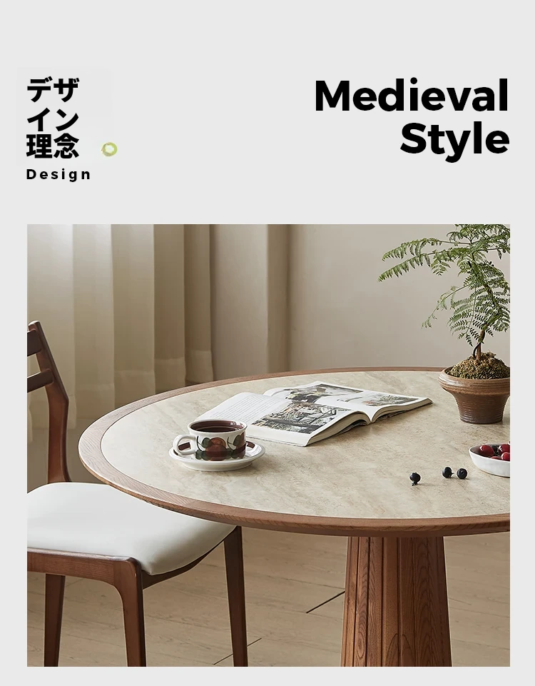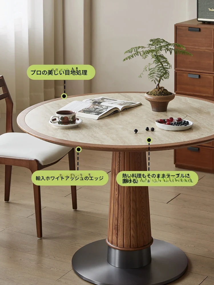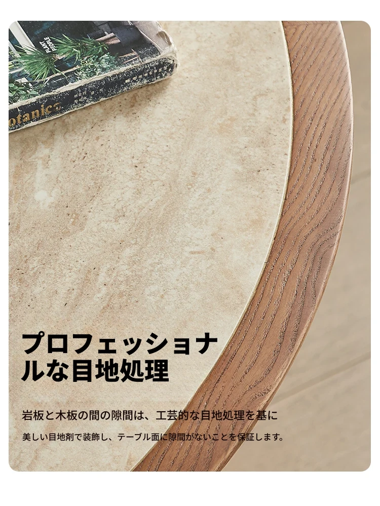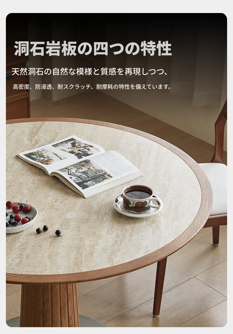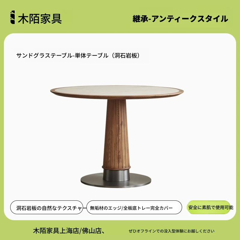 木製のレトロなサンドグラスデザインの丸型ダイニングテーブル - 小さなスペースに最適!天然石の天板と無垢材の縁取りで、温かみのある雰囲気を演出。おしゃれで実用的な食卓をあなたの家に。