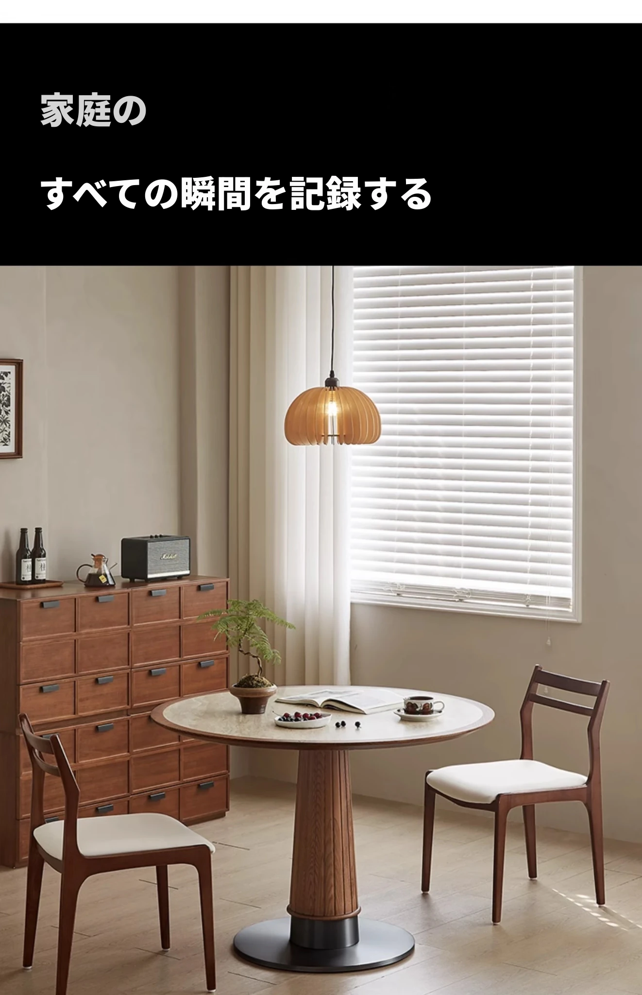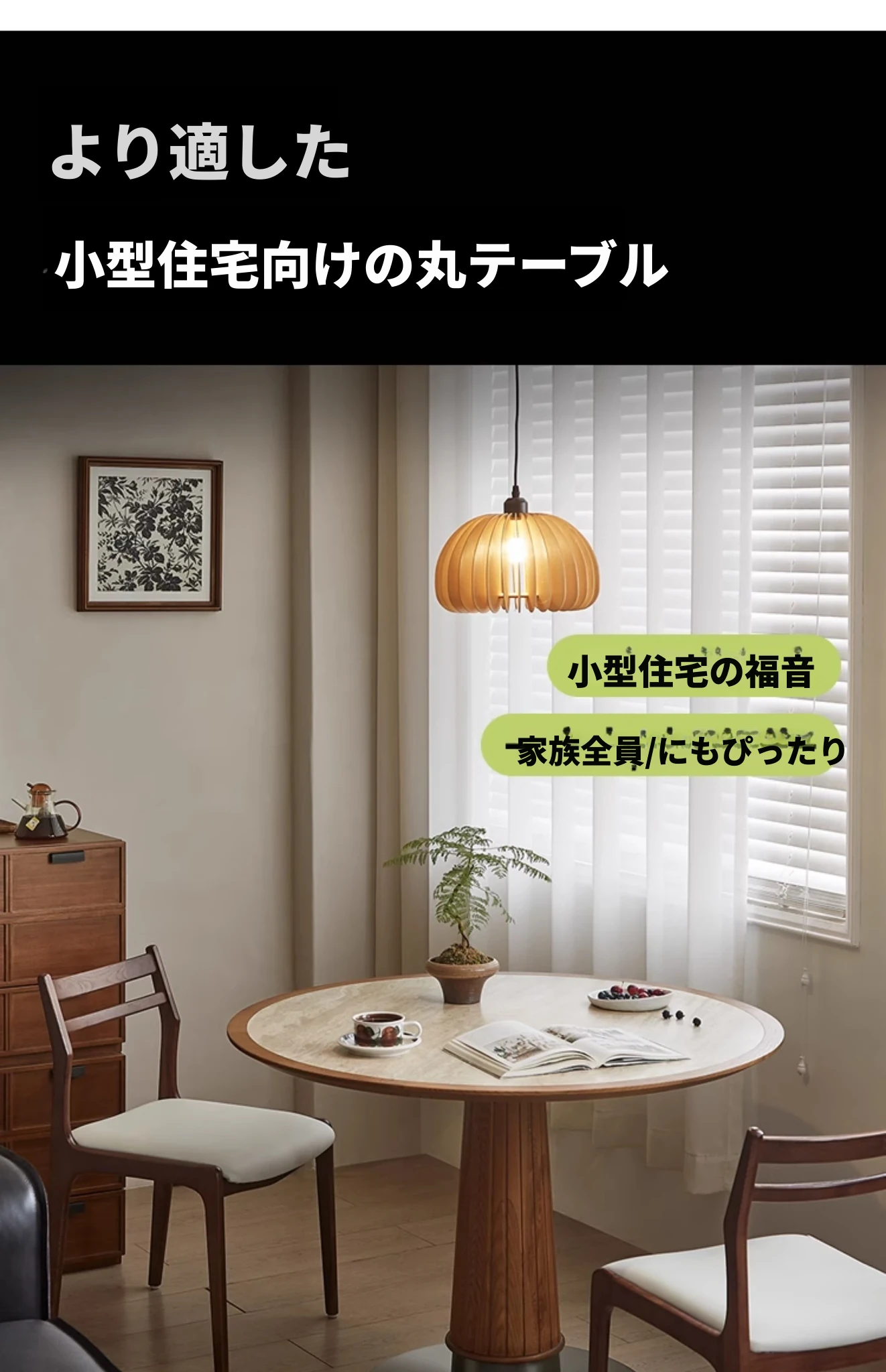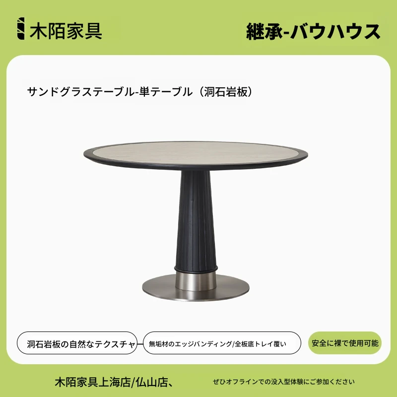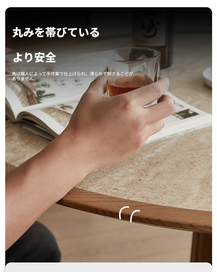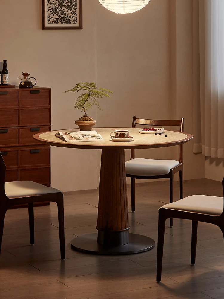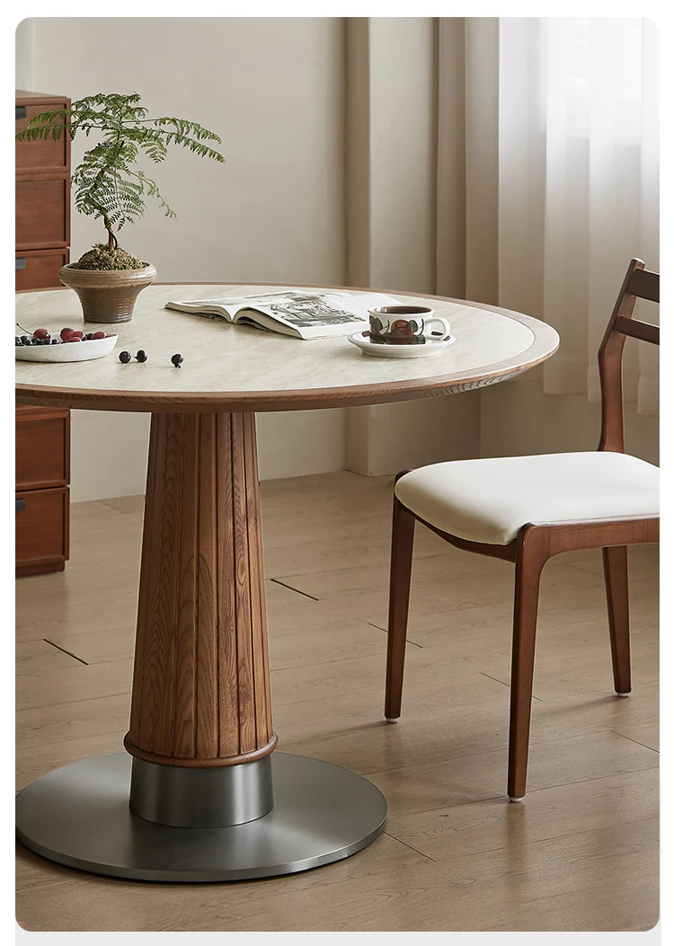 木製のレトロなサンドグラスデザインの丸型ダイニングテーブル - 小さなスペースに最適!天然石の天板と無垢材の縁取りで、温かみのある雰囲気を演出。おしゃれで実用的な食卓をあなたの家に。