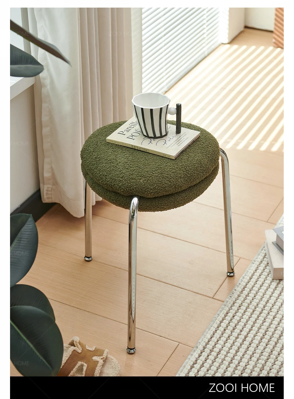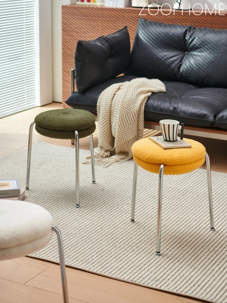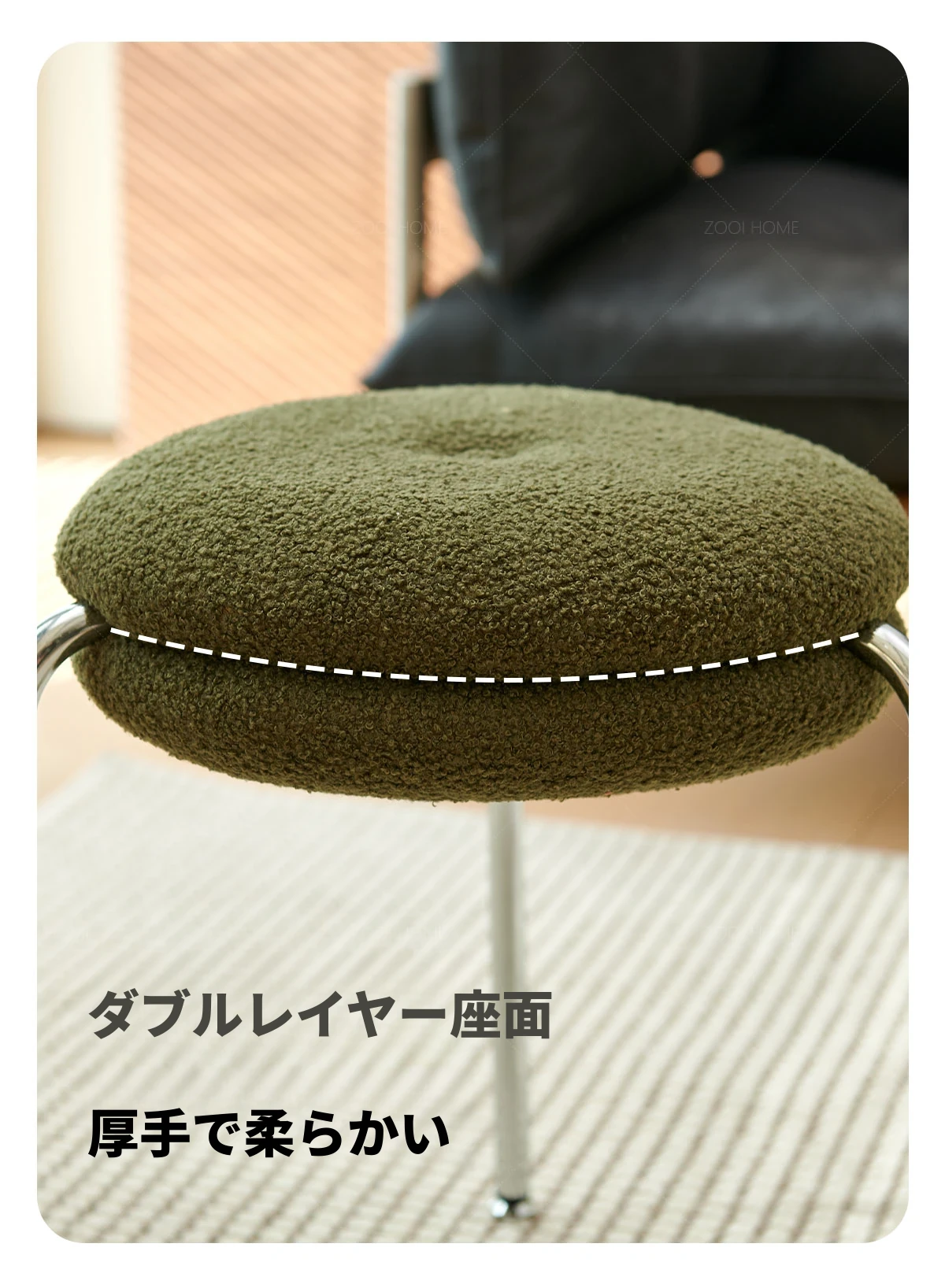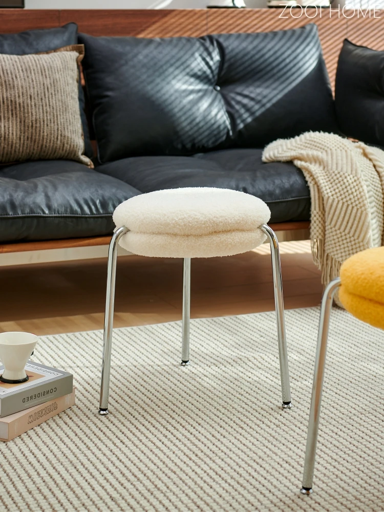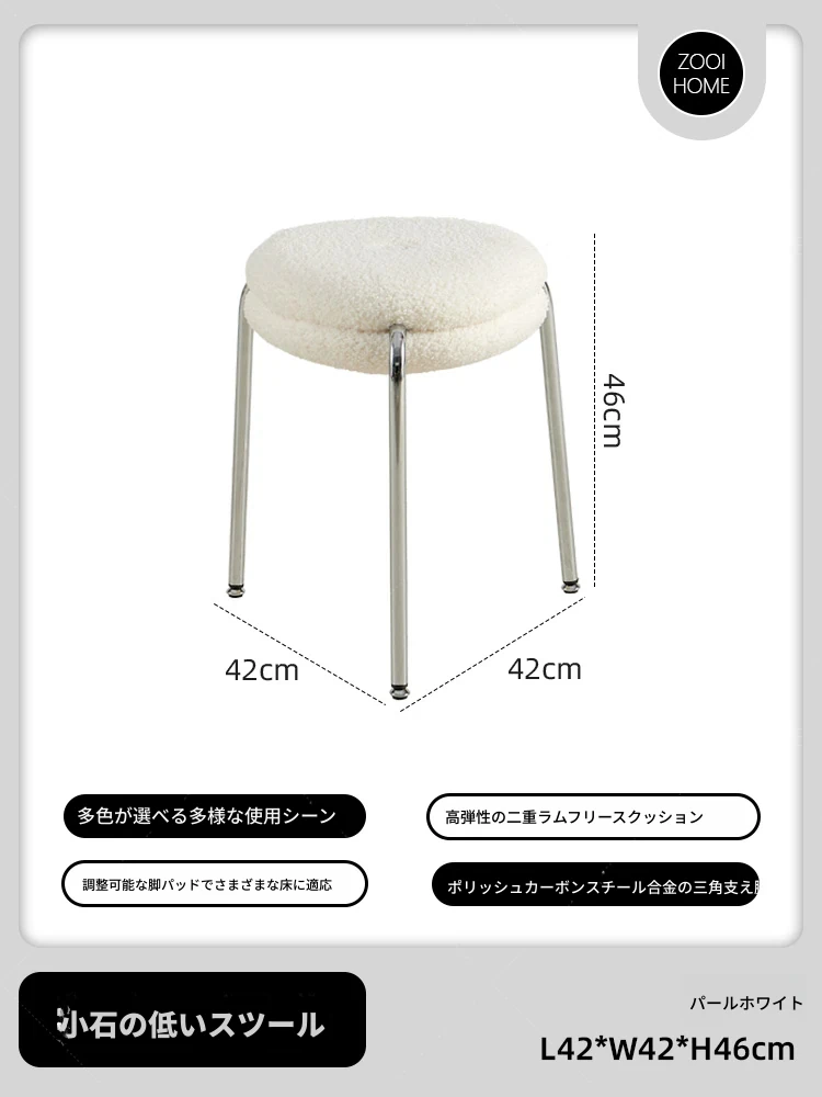 ZOOI HOMEのエレガントなオーストリッチスツール - ラグジュアリーなラムファーとクリーミーなデザインで、リビングの休息空間に最適!おしゃれなシューズチェンジ用スツールとしても大活躍!