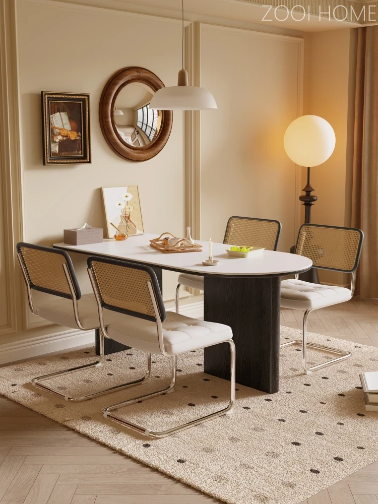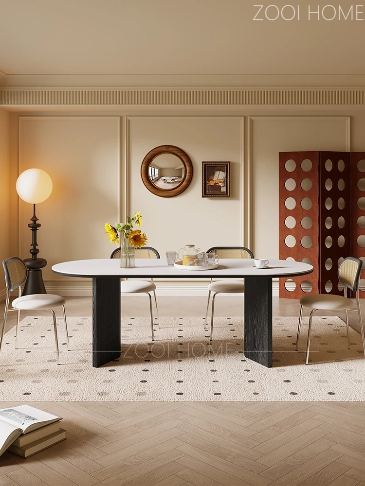 ZOOI HOMEのホワイトアッシュ製オーバルダイニングテーブル - 家庭用軽奢スタイル、個性的なブラックフレンチクリームデザインのアイランドテーブルで、特別なひとときをお楽しみください。