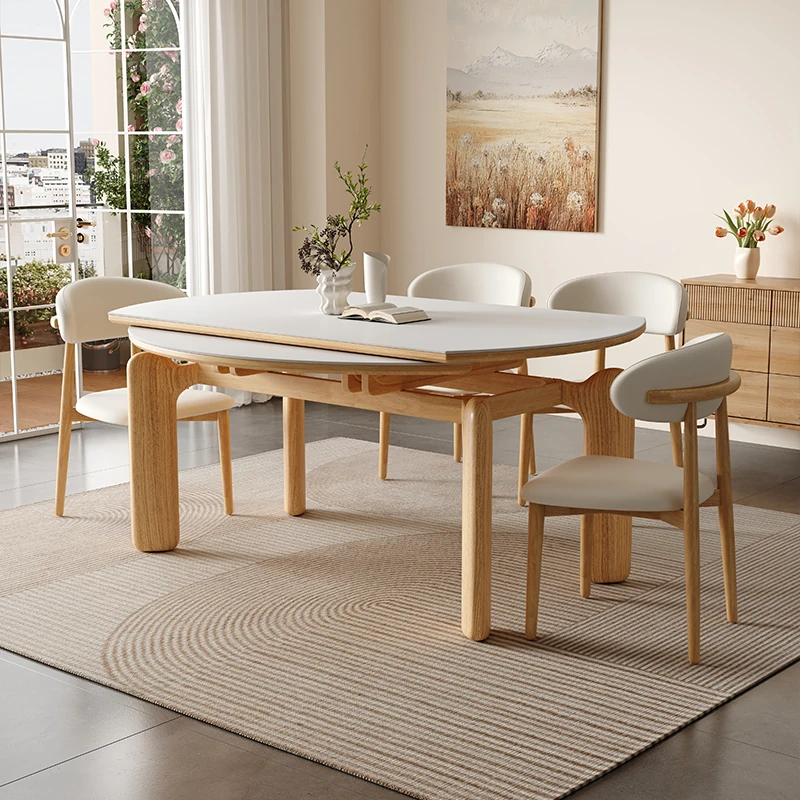 伸縮式ウッド・ラグジュアリー・ストーンテーブルセット|モダンなミニマリストデザイン|折りたたみ可能で小さなリビングに最適|家庭用ダイニングテーブルと椅子のコンビネーション