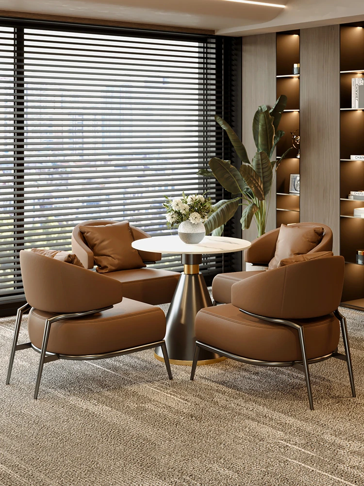 イタリアンスタイルのシンプルなリクライニングソファと2つの椅子、軽やかなラグジュアリーオフィス向けの接客・打ち合わせテーブルセット。洗練されたデザインで、心地よいひとときを提供します。